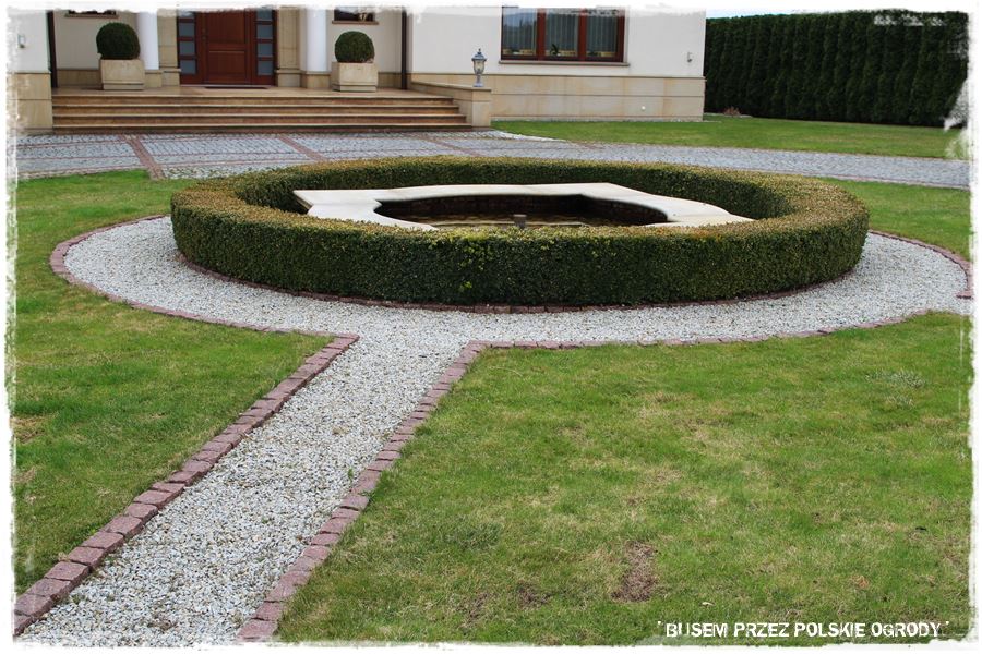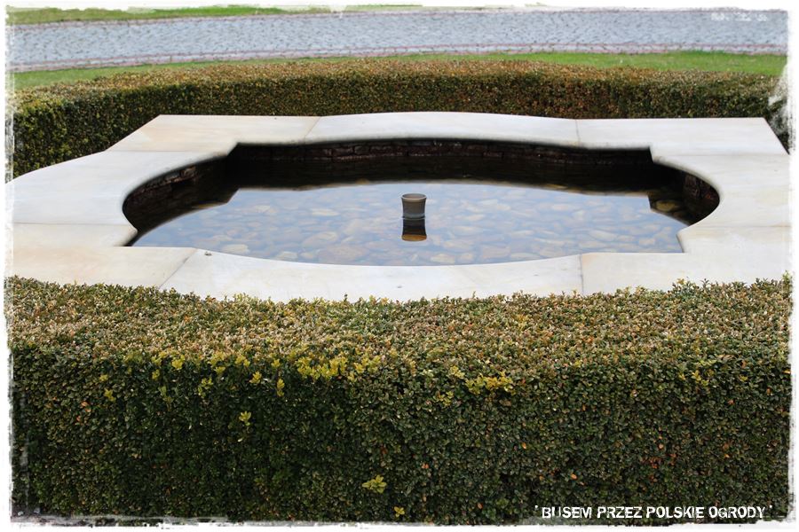 oraz zlokalizowaną centralnie na środku fontanną, ukrytą nieco w bukszpanowej obwódce.