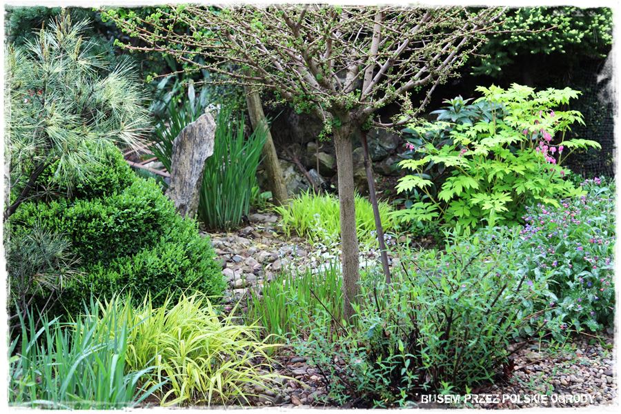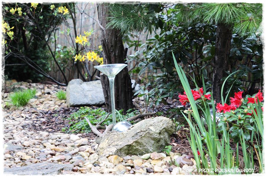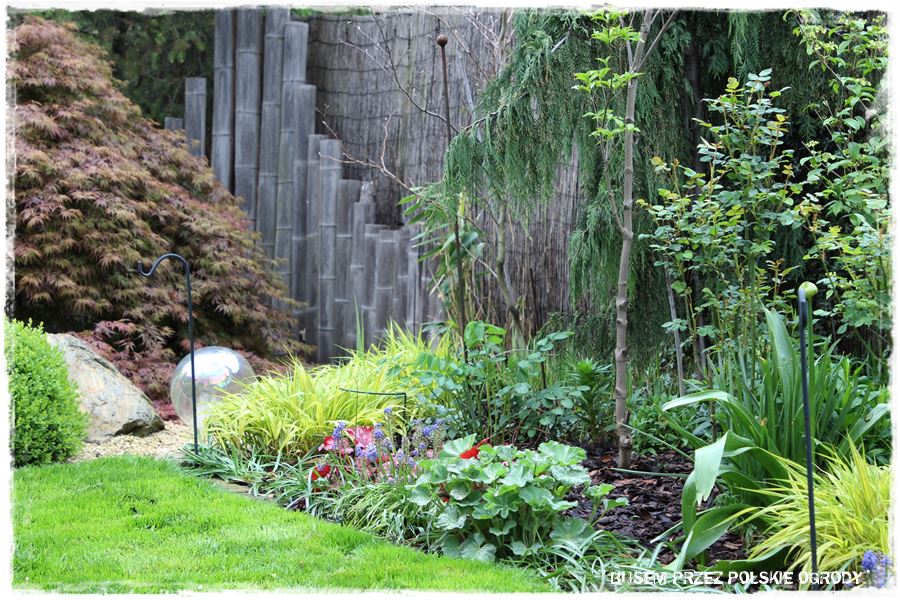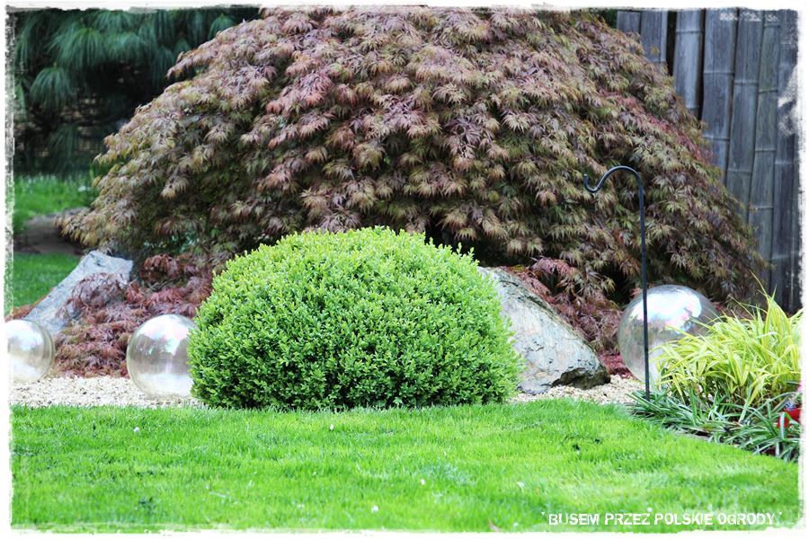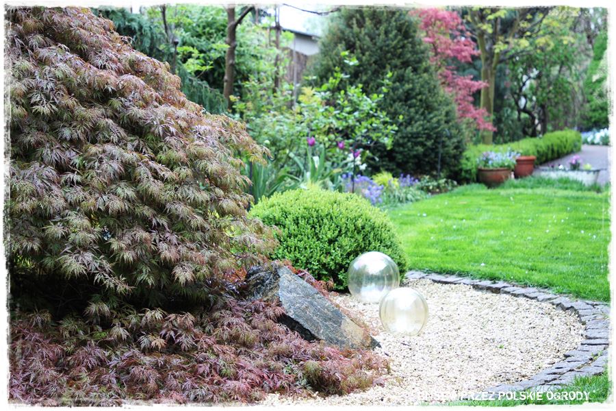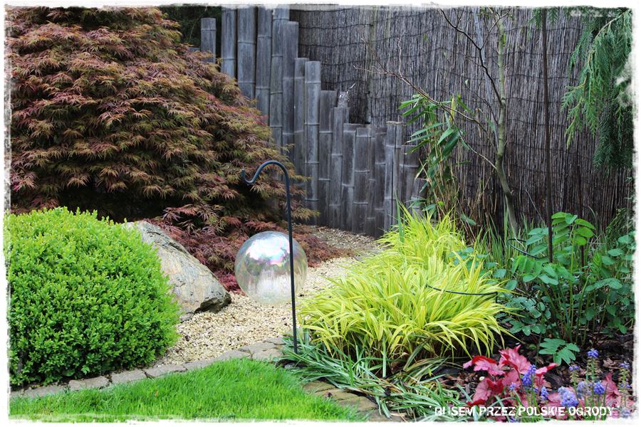 Jak wspomniałem, miejsce to ma w sobie wiele elementów zaczerpniętych wprost z ogrodów japońskich. Wyglądają oryginalnie, ale przede wszystkim wyjątkowo zdobią i urozmaicają tylną część ogrodu. Do najważniejszych z nich należy kamienna rabata z wyjątkowym klonem i bambusowymi dodatkami,