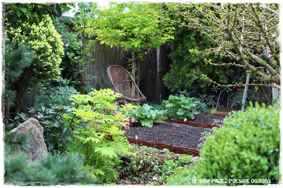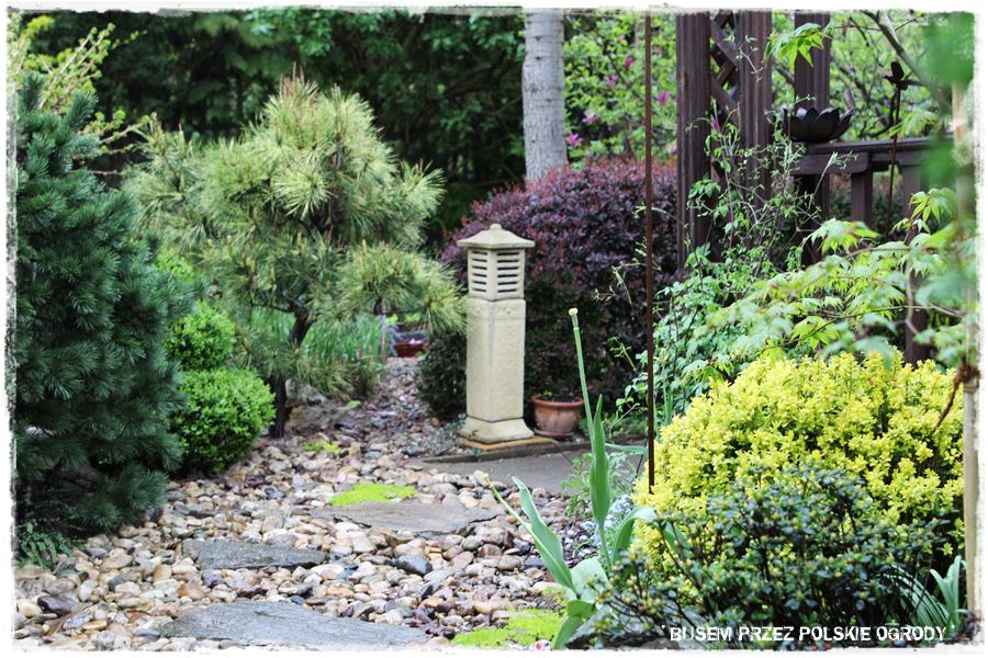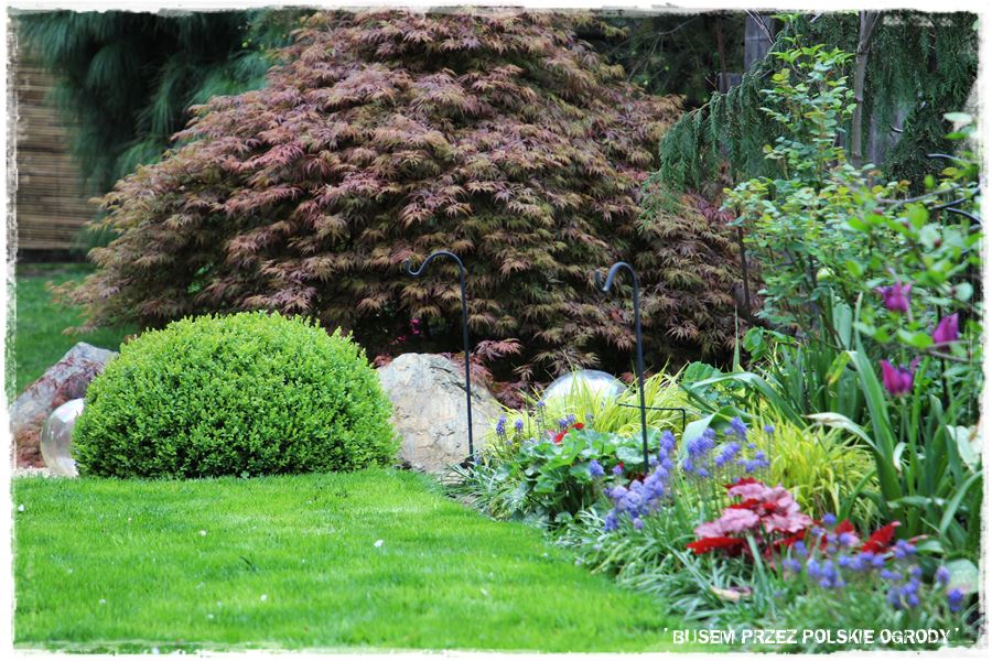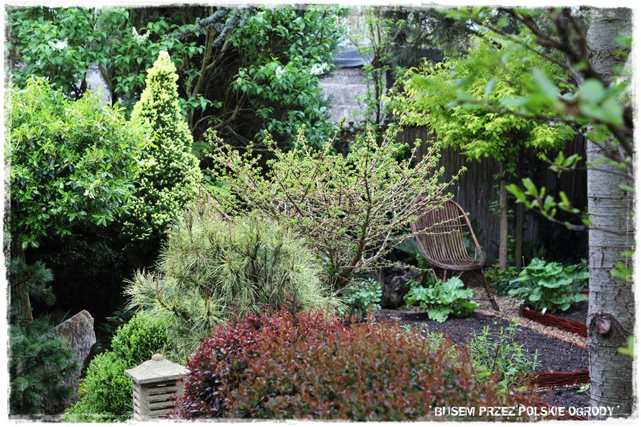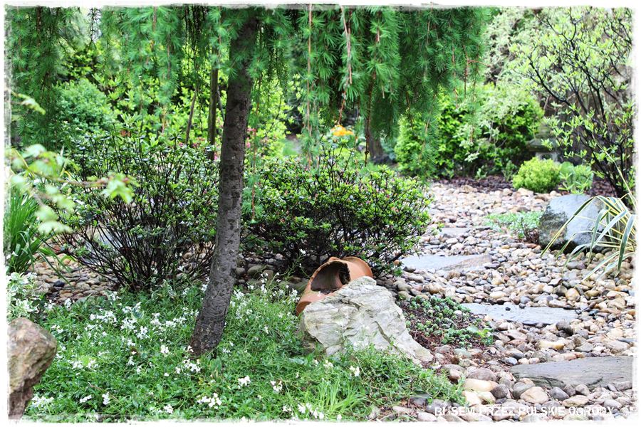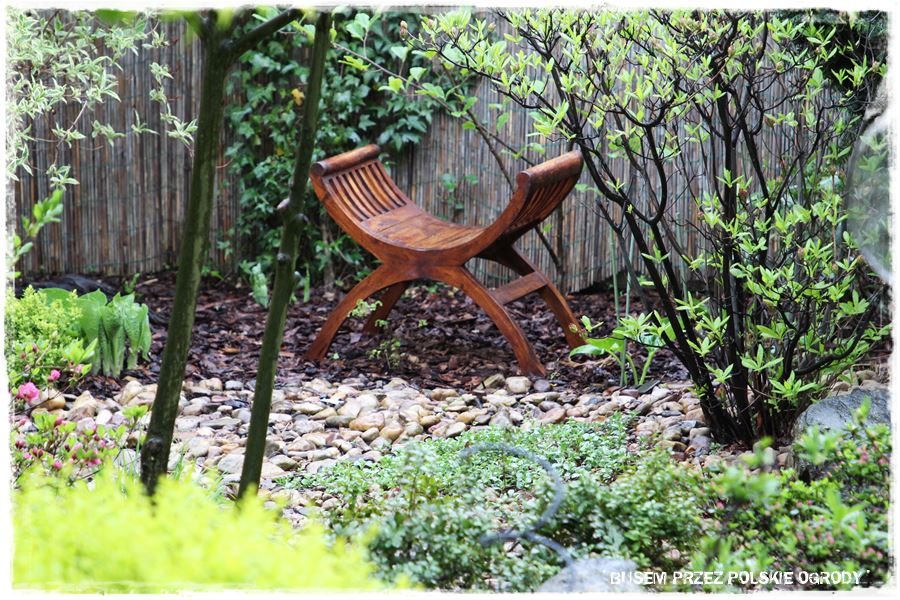 Jak wspomniałem, miejsce to ma w sobie wiele elementów zaczerpniętych wprost z ogrodów japońskich. Wyglądają oryginalnie, ale przede wszystkim wyjątkowo zdobią i urozmaicają tylną część ogrodu. Do najważniejszych z nich należy kamienna rabata z wyjątkowym klonem i bambusowymi dodatkami,