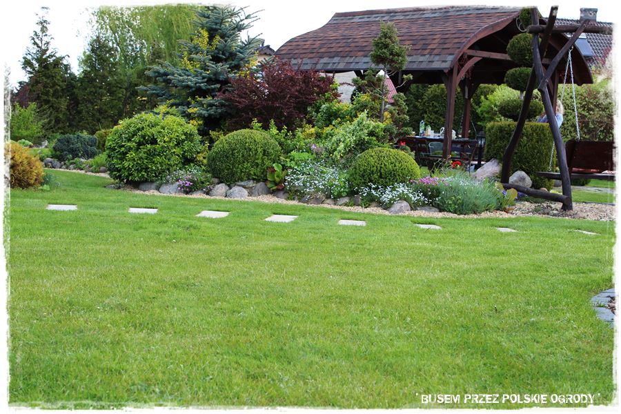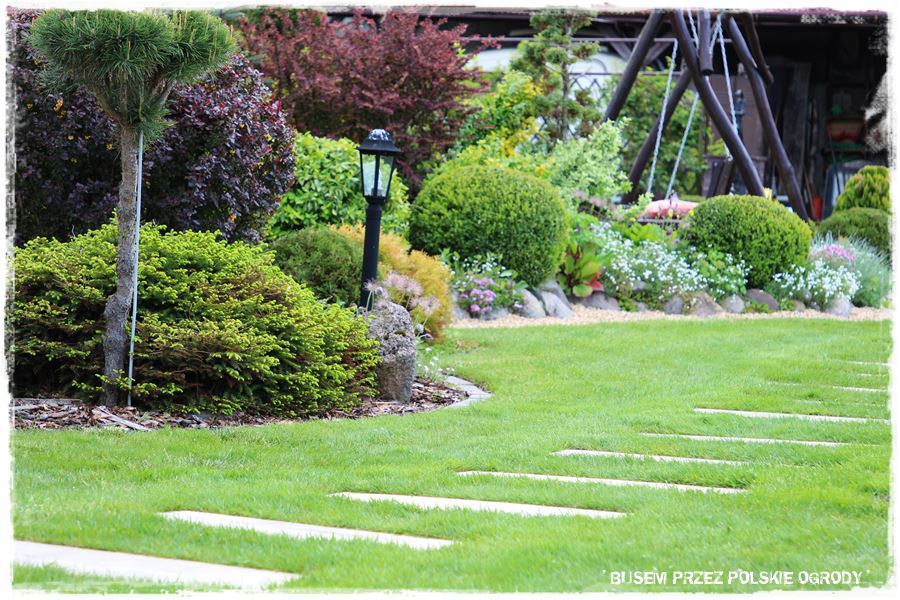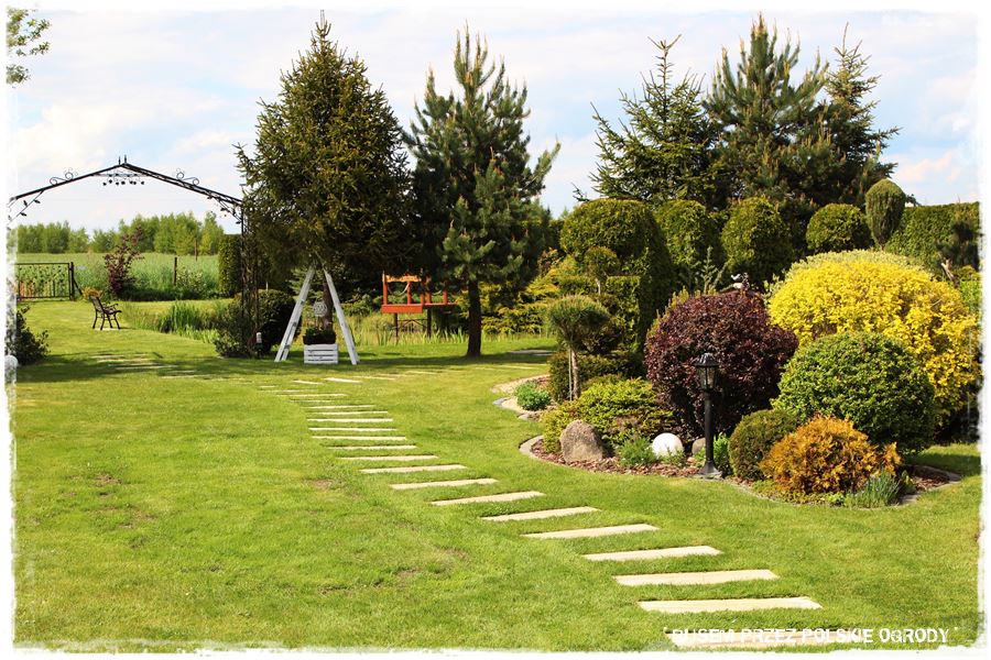 Oryginalnym elementem ogrodu są chodniki, a właściwie wkomponowane w trawnik płyty,