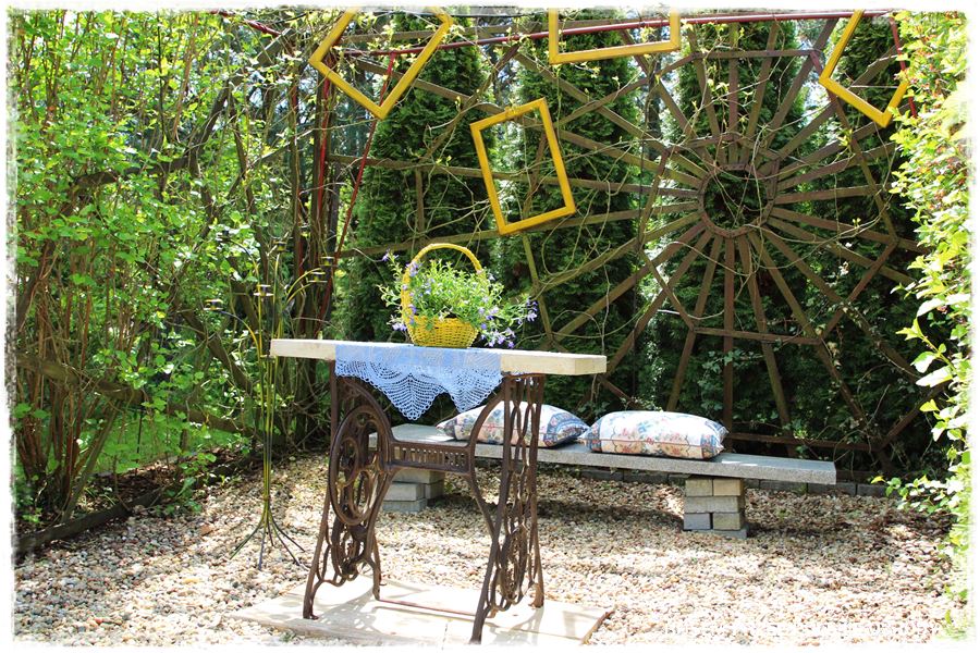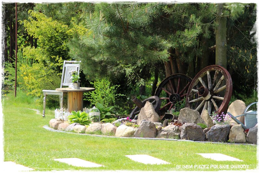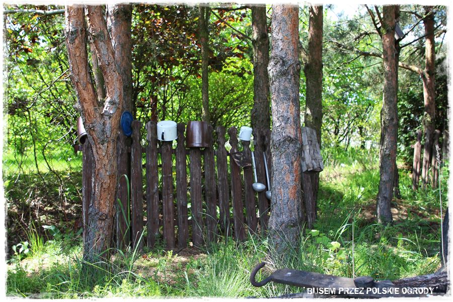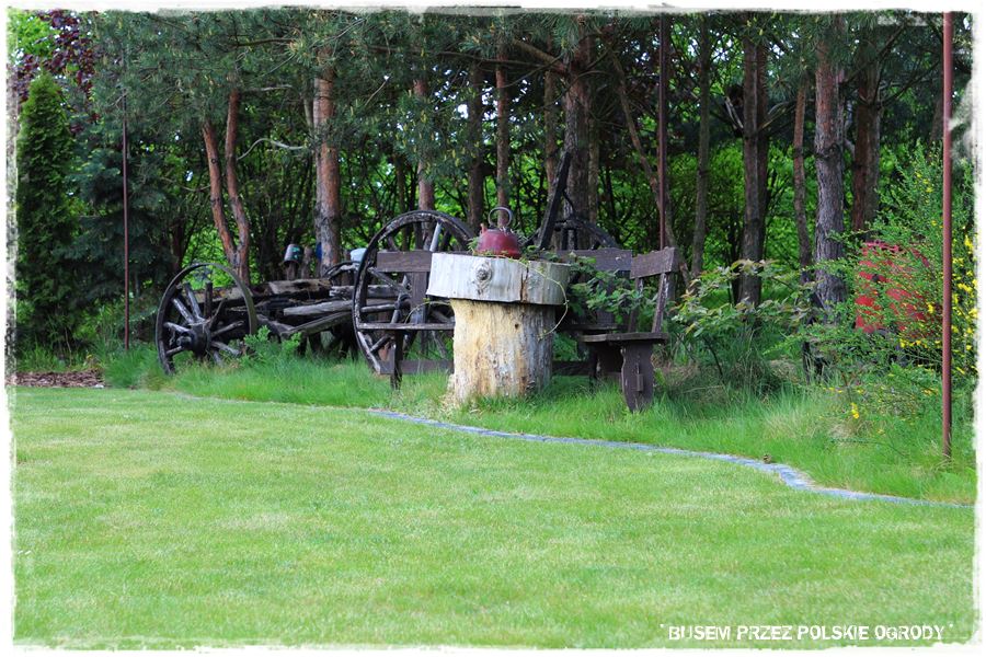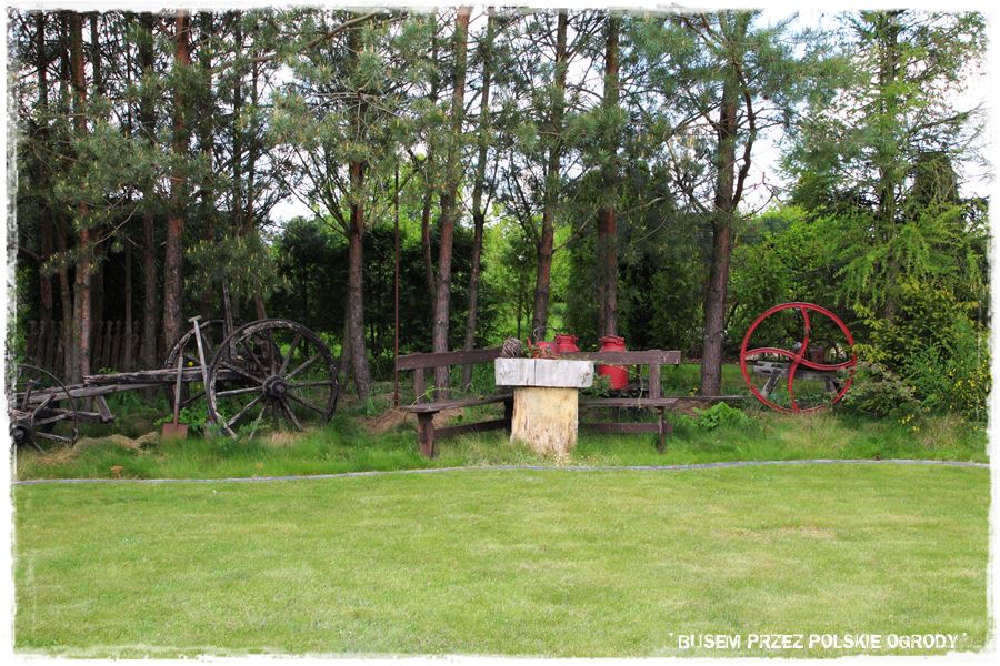 Super fajnym elementem ogrodu, a zarazem oryginalnym rozwiązaniem jest ogrodowy mini skansen. Ale co więcej, jest on urządzony na takiej mini wyspie, będącej ogrodową enklawą, zupełnie inną od pozostałej części ogrodu. To taki mini lasek sosnowy, nie koszony, nie utrzymywany tak regularnie jak pozostała część ogrodu. Fajny kontrast, a zarazem idealne tło dla tych wszystkich, starych przedmiotów.