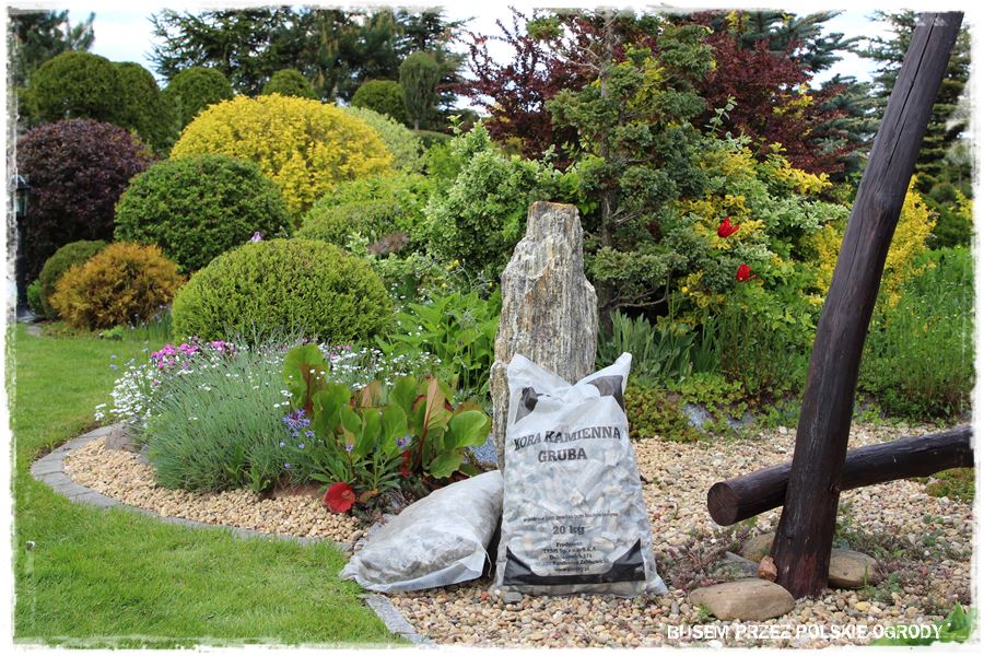 Natomiast na sam koniec ogrodowych zmagań, ustawiliśmy w ogrodzie przywiezioną przeze mnie szpilkę gnejsową, która pięknie wkomponowała się w wiosenną rabatę.
