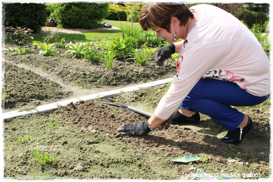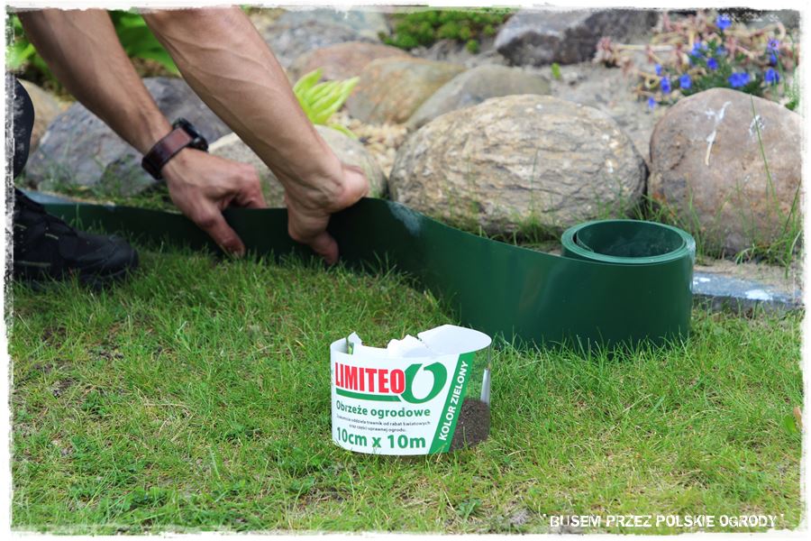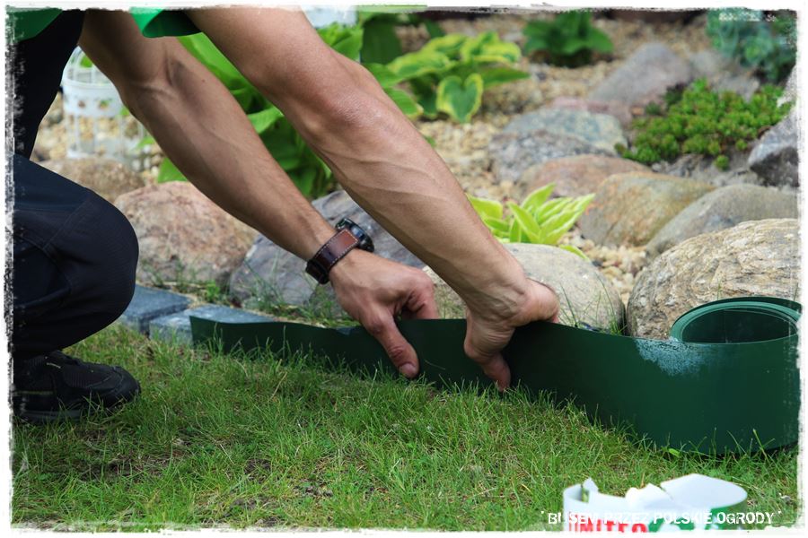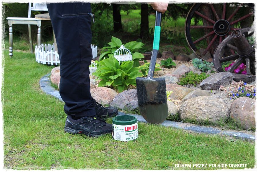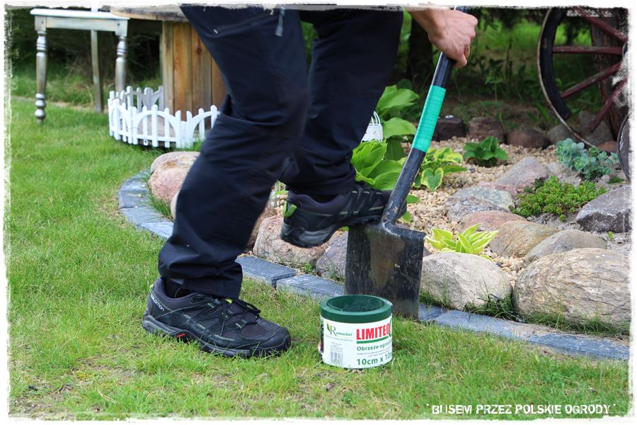 Z rozpędu, przy obrzeżu jednej z efektownych rabat, wkopaliśmy dodatkowe plastikowe obrzeże, które dobrze zabezpieczy przed wrastaniem trawy do rabaty.