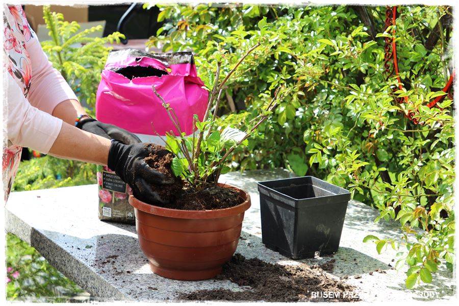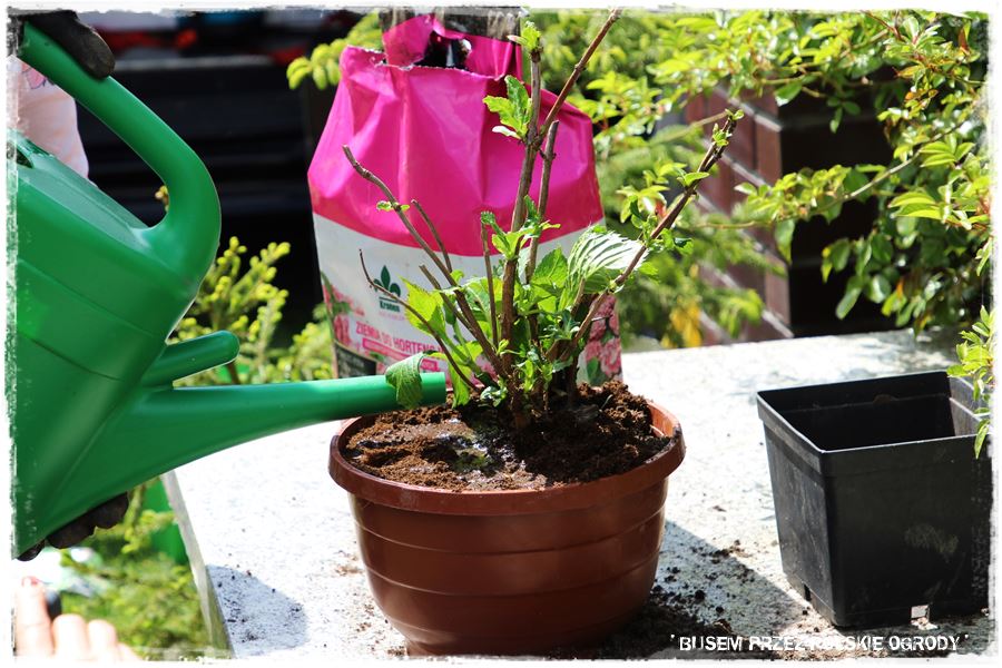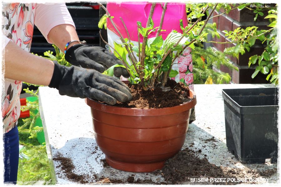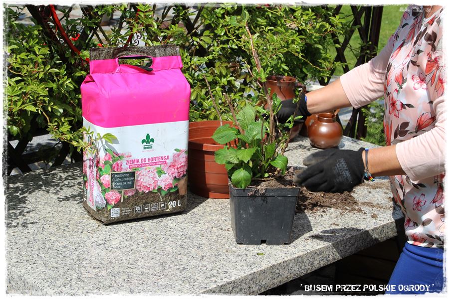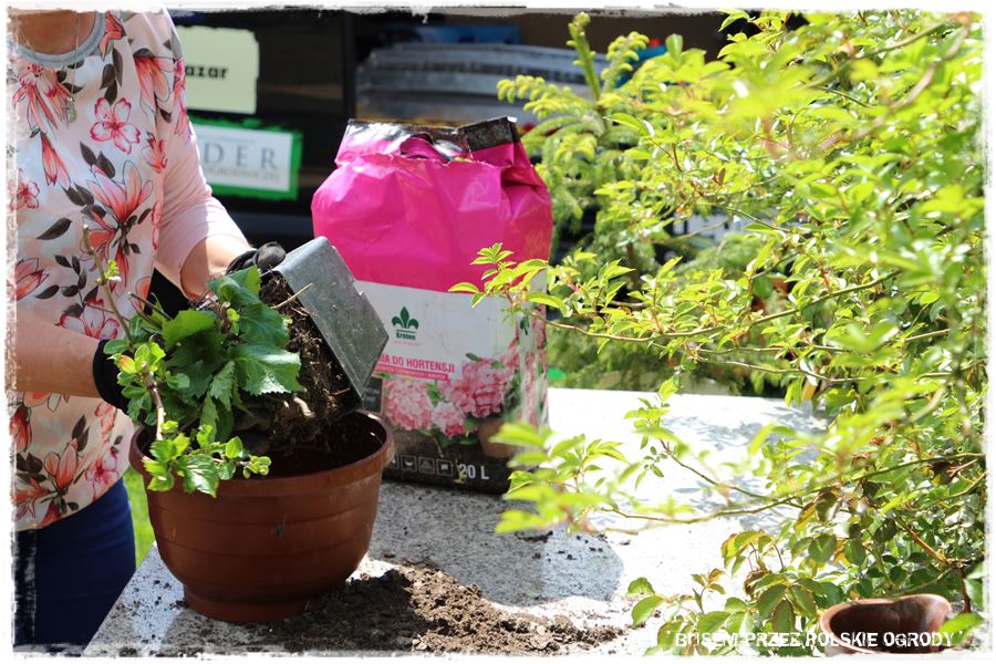 Z kolei do posadzenia hortensję, która w dedykowanym podłożu powędrowała do donicy.