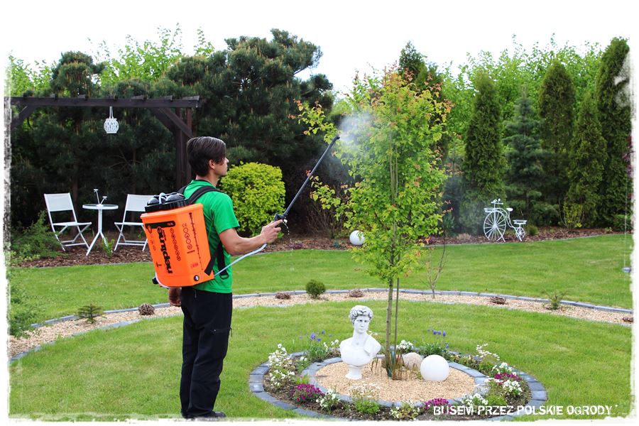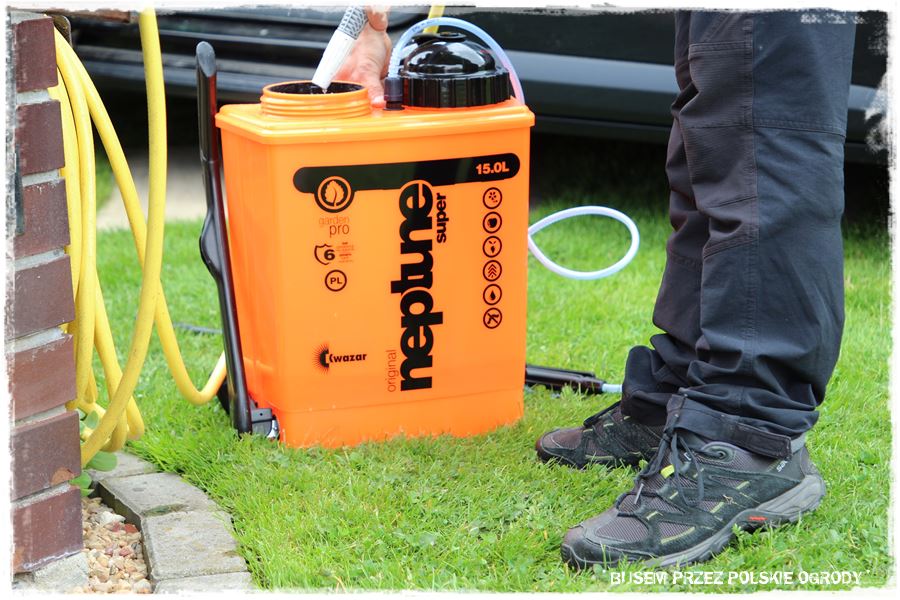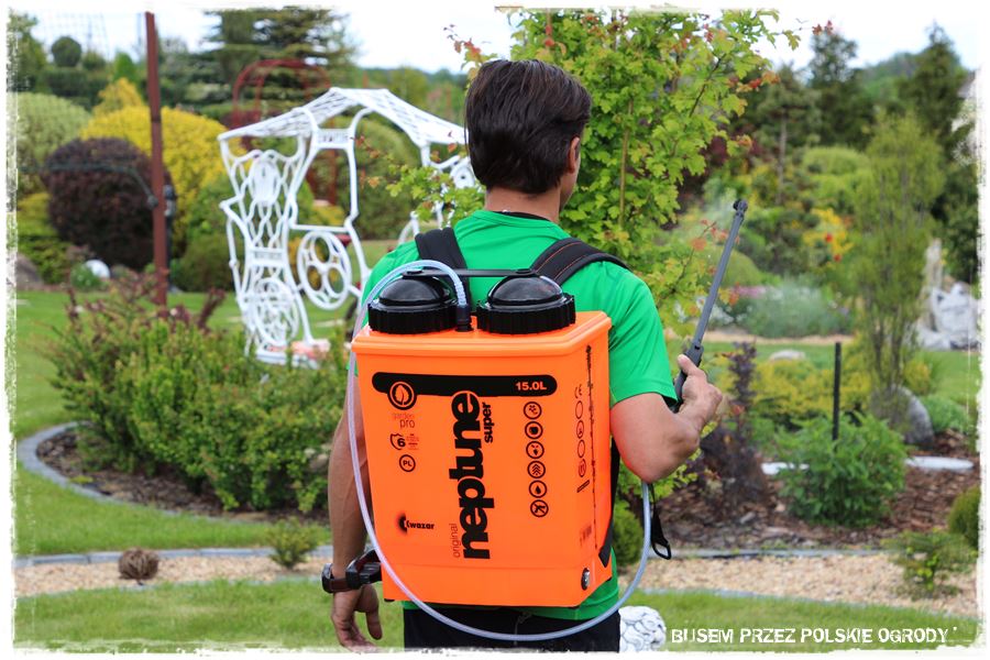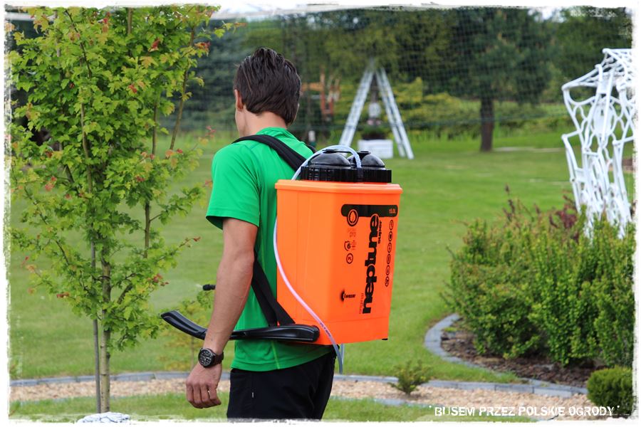 Następnie zrobiliśmy oprysk środkiem na mszycę, a ponieważ ogród jest duży i było sporo miejsc wymagających interwencji, posłużył nam do tego duży opryskiwacz plecakowy. To profesjonalne urządzenie, które zapewnia wygodną pracę, nawet podczas dłuższych zabiegów. Oczywiście posiada również szereg wymiennych lanc, a także praktyczny regulator ciśnienia, który pozwala na regulację w zależności od stosowanych cieczy.