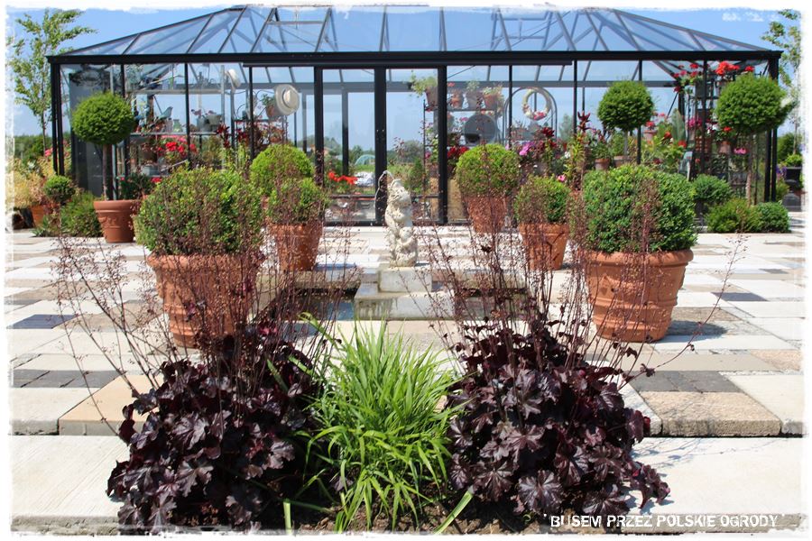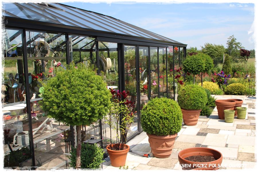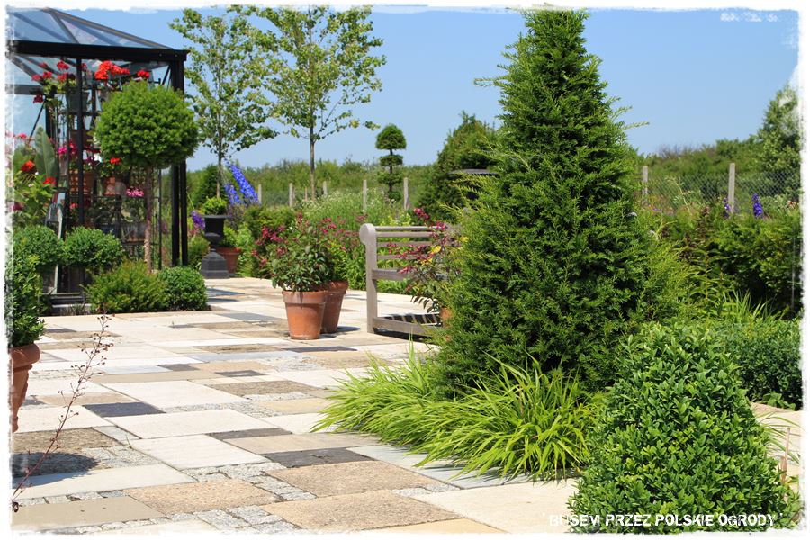 Ponadto duża, ozdobna szklarnia, posadowiona na ciekawie brukowanym placu, do którego materiał w 100% pochodzi z odzysku. Powstała z niego efektowna mozaika, moim zdaniem idealnie wpisująca się w założenia tego ogrodu.