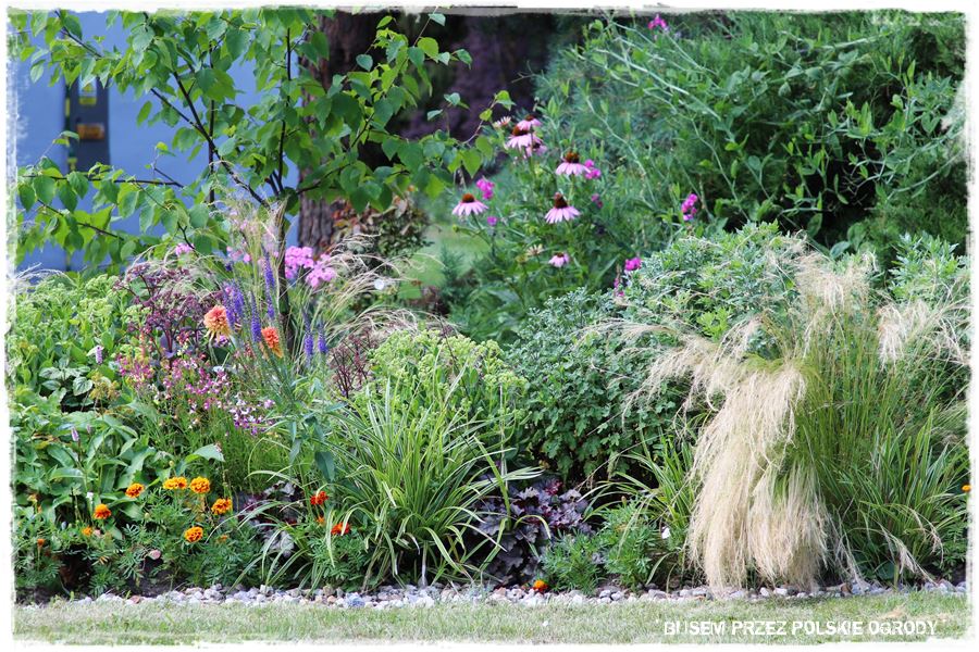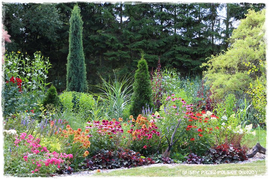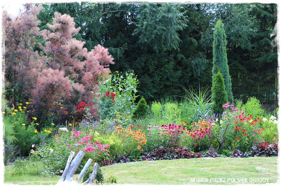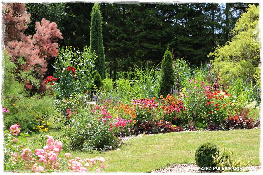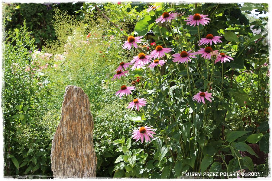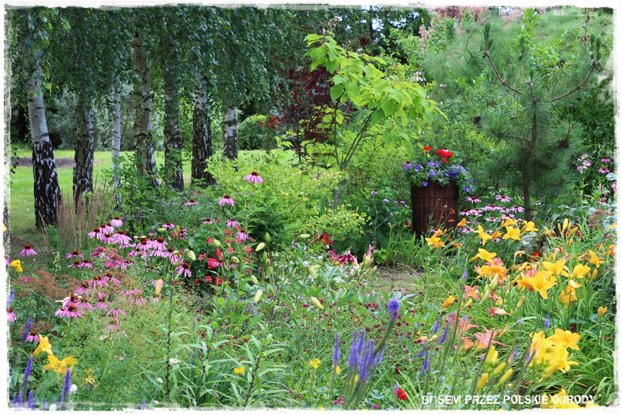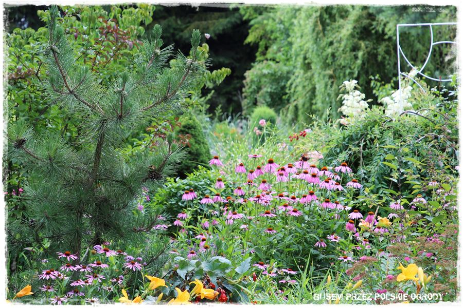 Kolejne rabaty, które warto wyróżnić, to te położone wokół trawników, w których królują efektownie kwitnące jeżówki.