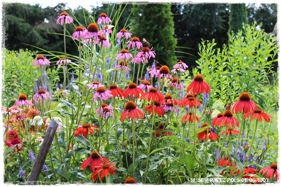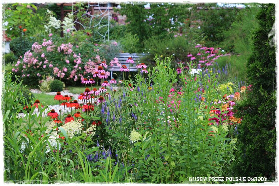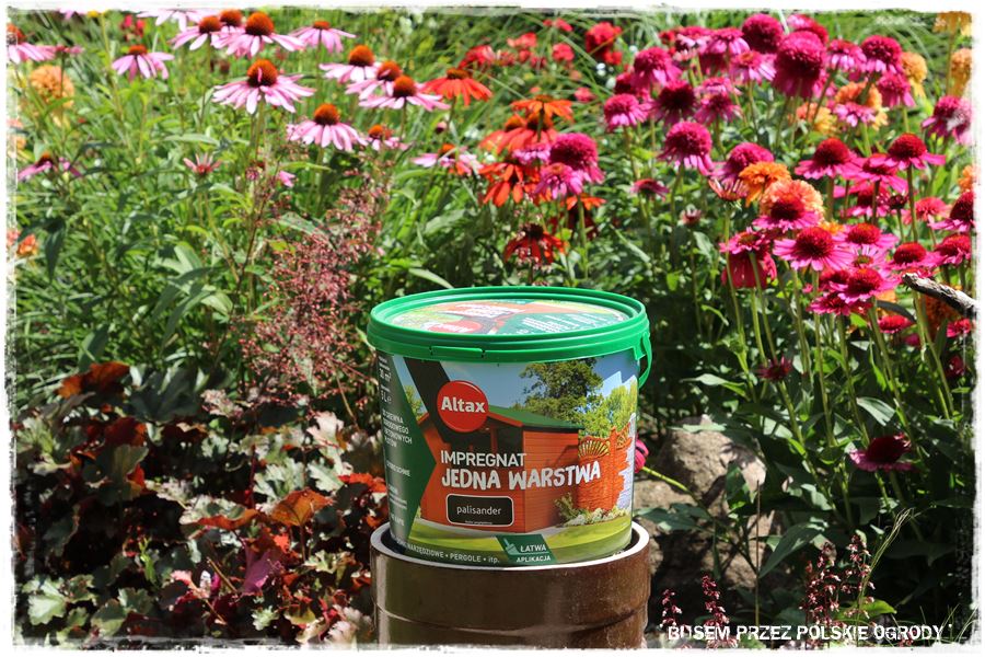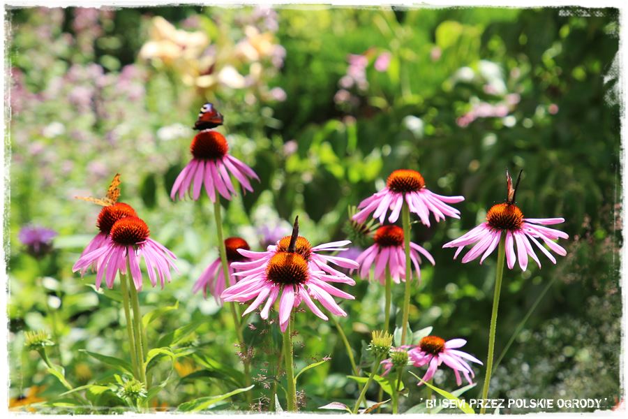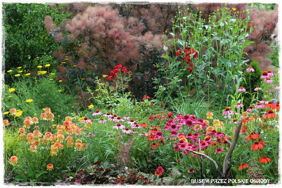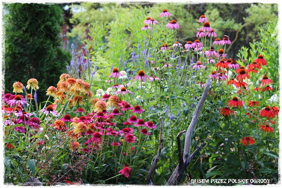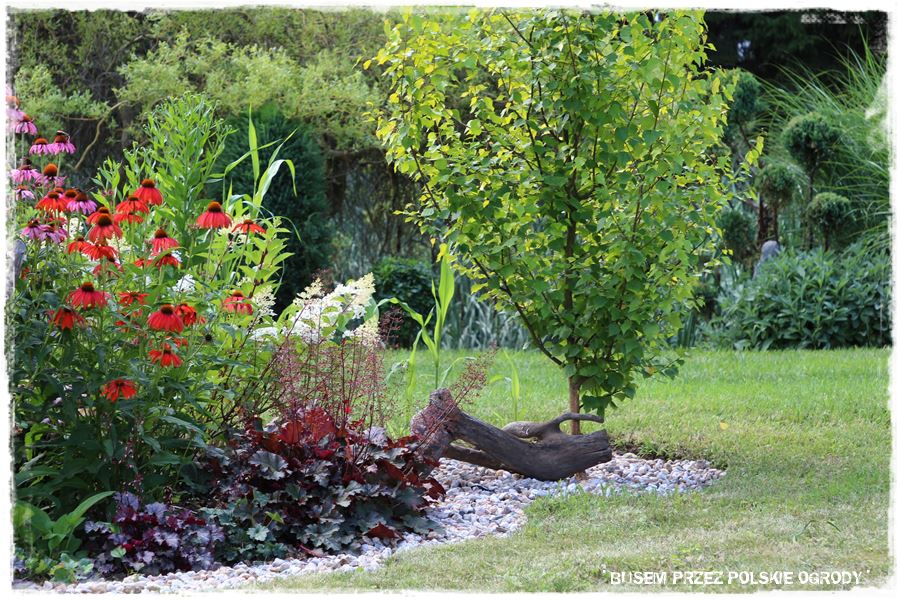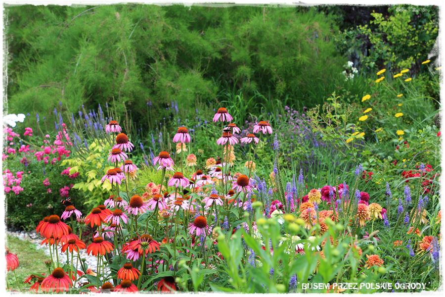 Kolejne rabaty, które warto wyróżnić, to te położone wokół trawników, w których królują efektownie kwitnące jeżówki.