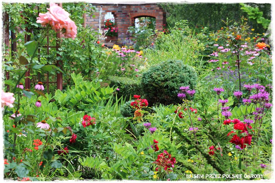 Tuż za nim, wąskim przejściem wchodzi się w głąb ogrodu, gdzie otwiera się wszystko to, co w nim najlepsze. Czyli wspomniane rabaty w stylu angielskim, z których rośliny dosłownie się „wylewają”.