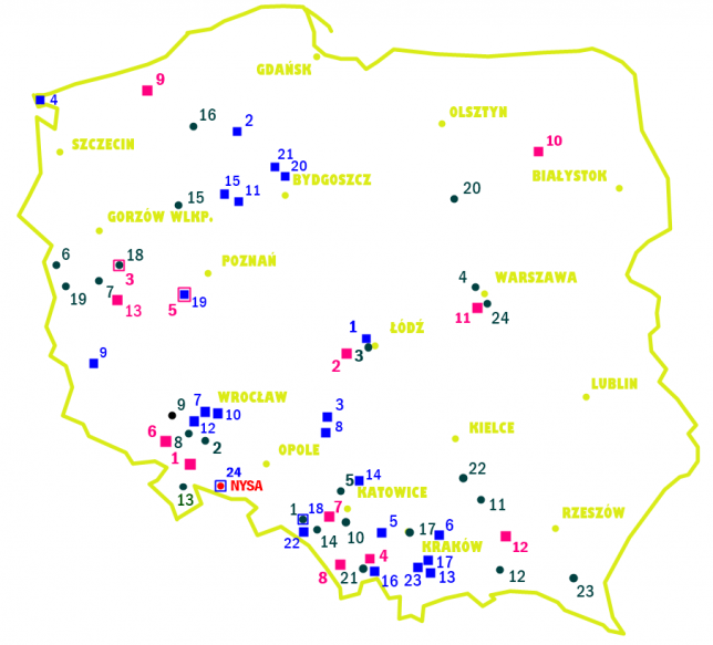 niebieskie kwadraty z numerami od 1 do 24, które obrazują wszystkie ogrody odwiedzone w sezonie 2 – 2019