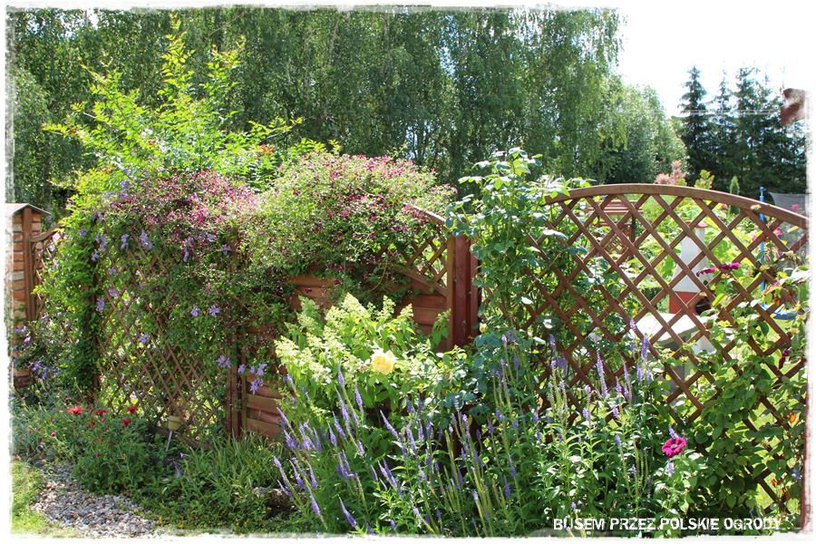 natomiast dla kontrastu, w przeciwległej części ogrodu, za ciekawie porośniętą przesłoną, znajduje się zadbana część warzywna.