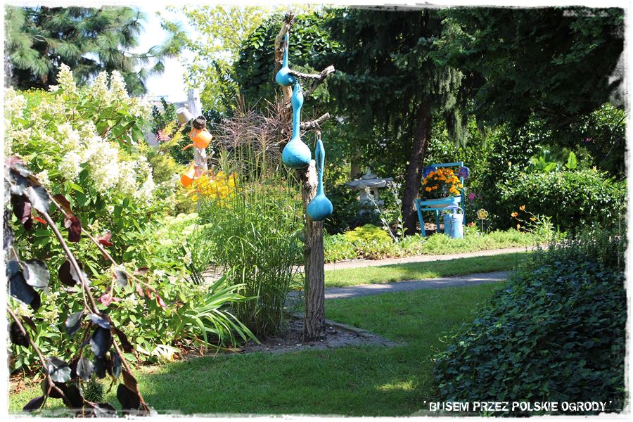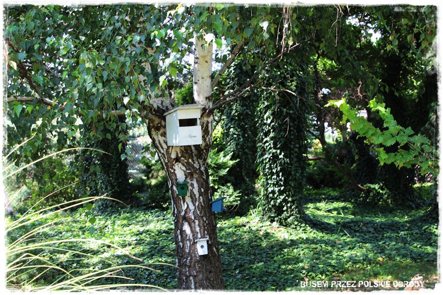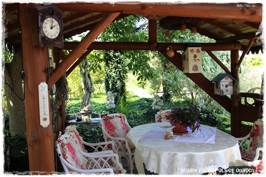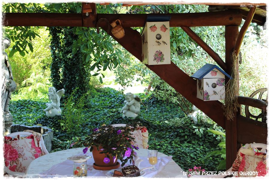 Na uwagę zasługuje także stylowa altana ukryta pod dużym orzechem, również ciekawie ozdobiona.