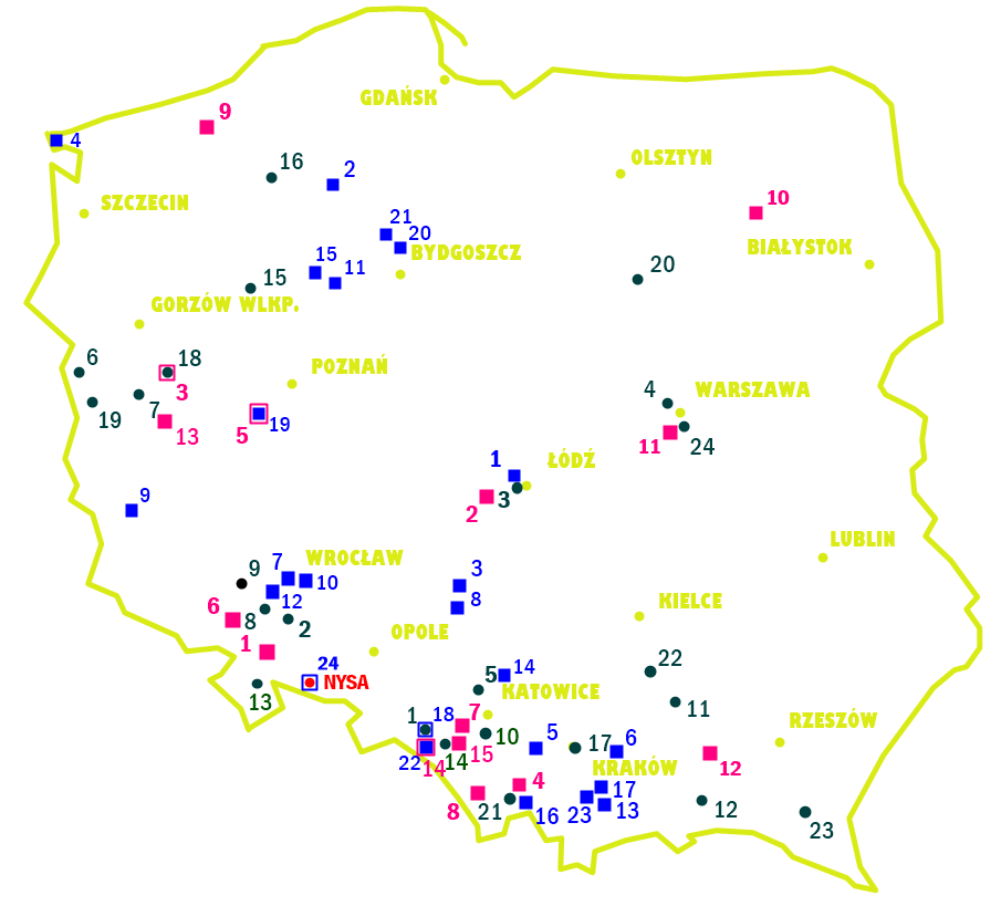 niebieskie kwadraty z numerami od 1 do 24, które obrazują wszystkie ogrody odwiedzone w sezonie 2 – 2019