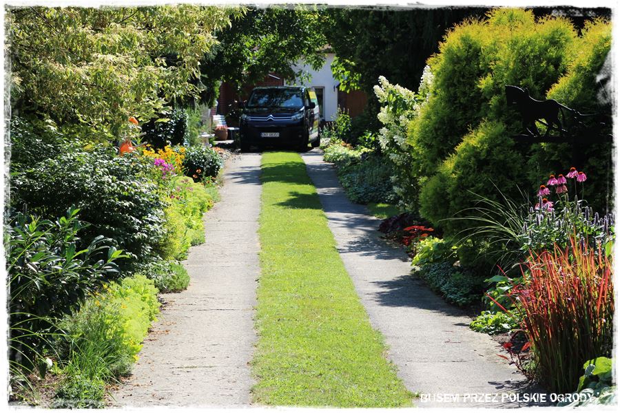 Ogród zatem rozciąga się po lewej i prawej stronie podjazdu, tworząc zróżnicowane i urozmaicone pod względem roślin i dekoracji aranżacje.