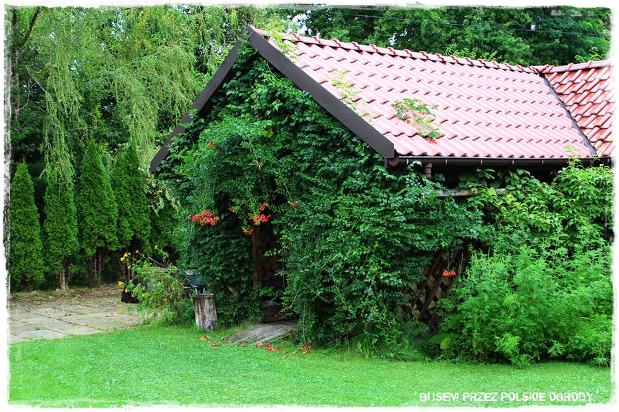 Poza altaną znajduje się tam również druga wiata, będąca w jednej części drewutnią, w drugiej wiatą na samochód. Co ważne obie budowle są w tym samym stylu, przez co ładnie się komponują i wpisują w swoje otoczenie.