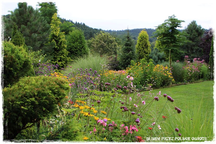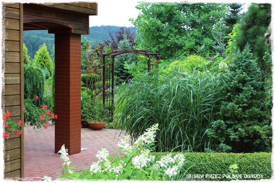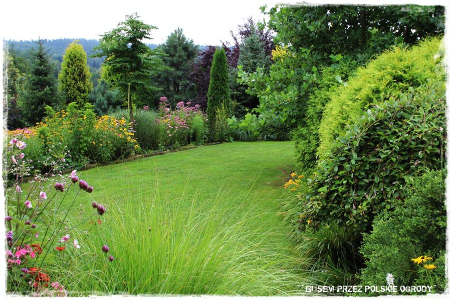 Jak pewnie już wiesz z poprzednich relacji, każdy z odwiedzonych ogrodów staram się na wstępie jakoś nazwać i zatytułować. Tak, aby na początku nastawić Cię na to, czego możesz się po nim spodziewać. Innymi słowy, staram się znaleźć jakąś główną cechę i wyróżnik danego miejsca, który zdecydowanie odróżnia go od pozostałych. I tak jest również w tym przypadku. A wyróżnikiem tego miejsca są trawiaste tarasy, które zostały wymuszone przez pochyłe ukształtowanie działki. Dzielą ogród na kilka odrębnych stref, które rozdzielone są gęstymi nasadzeniami. Jest to pierwsza cecha tego ogrodu. Druga, nie mniej ważna to jego położenie. A to jest wyjątkowe. W pięknej, górzystej okolicy, na tle pagórków, które tworzą naturalne, zapożyczone tło. Innymi słowy ogród wcale się nie kończy i optycznie sięga aż po sam horyzont.