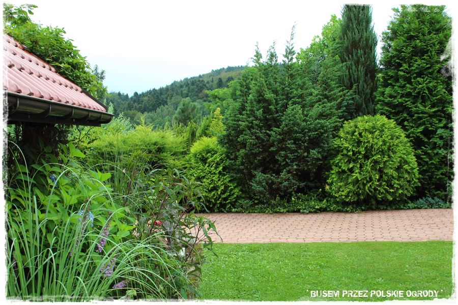 Szesnasty odwiedzony ogród leży w niewielkiej miejscowości w okolicy Dobczyc, w województwie małopolskim, jak już wiesz, w przepięknym, górzystym terenie. Cała nieruchomość ma około hektara, natomiast część wydzielona pod dom i ogród ma około 16 arów. A zatem już całkiem sporo aby zrealizować ciekawe założenia. Cały teren jest lekko pochyły i opada od przodu, ku tyłowi. Wymusiło to zatem tarasowe zagospodarowanie, czyli kilka wypłaszczonych przestrzeni, poprzedzielanych skarpami. Jest to często spotykane rozwiązanie na pochyłych terenach, jednak w tym ogrodzie zostało bardzo ciekawie rozwiązane. I o tym już za chwilę…