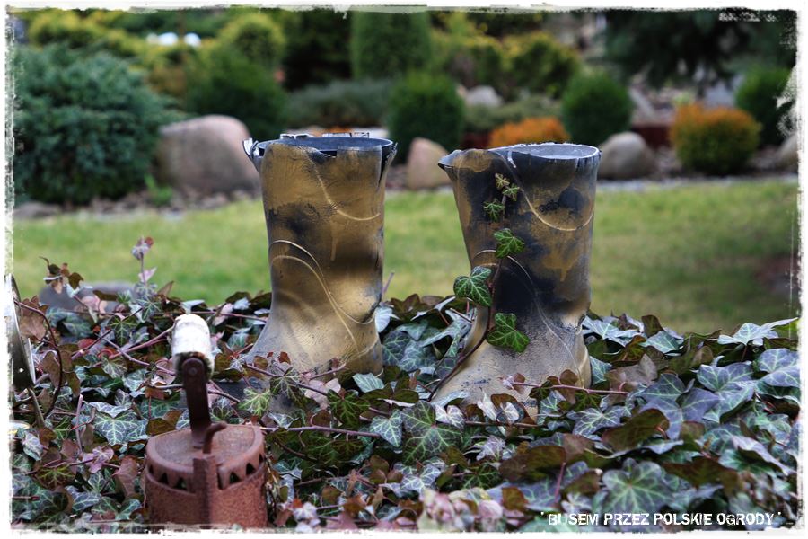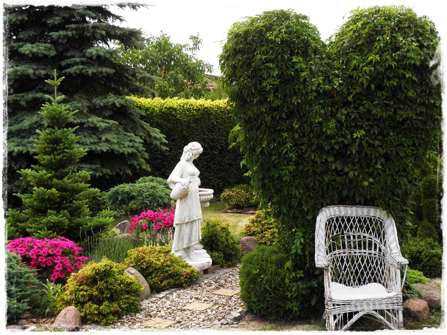 Ogród Gosi, czyli jak wiesz „Raj Małgosi” to ogród, w którym na każdym kroku widać kobiecą rękę. W sposobie urządzenia, w licznych dekoracjach, czy nasadzeniach jak chociażby to wielkie bluszczowe serce. Tylko kobieta mogła wymyślić coś takiego. Podczas mojej wizyty nie miało liści,
