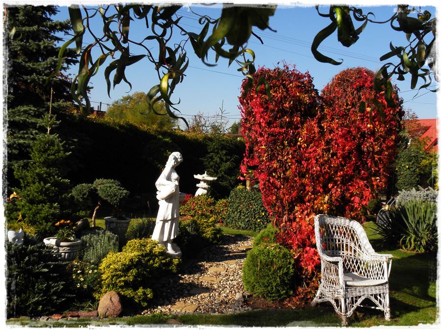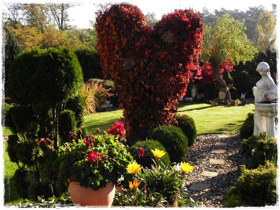 Ogród Małgosi jest pełen kolorów i ciekawych dekoracji.Serce z winobluszczu jest jego wizytówką,o każdej porze roku wygląda zjawiskowo.
