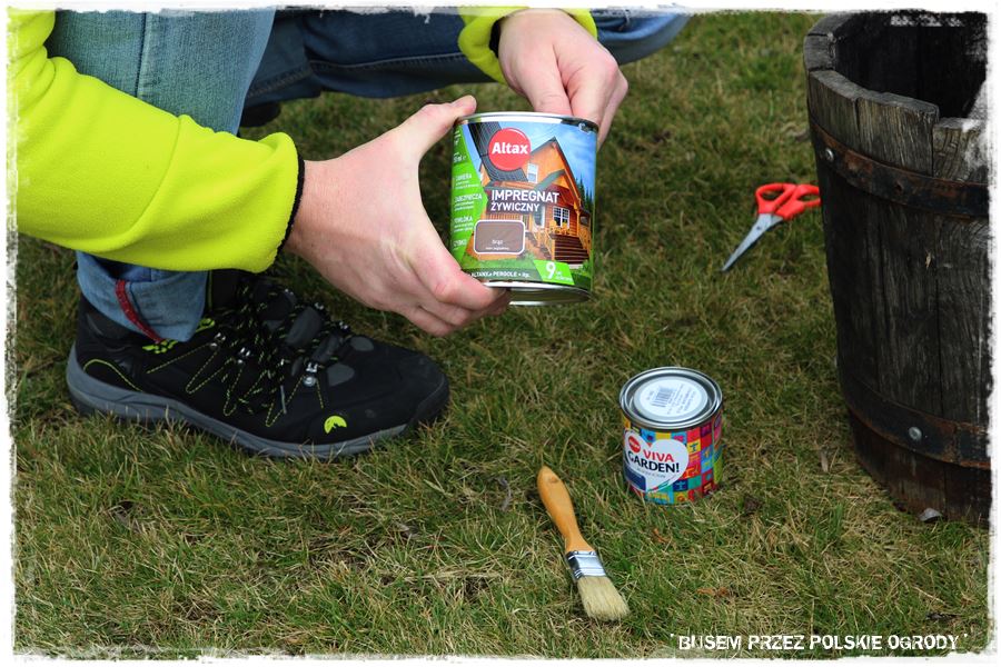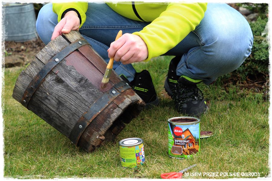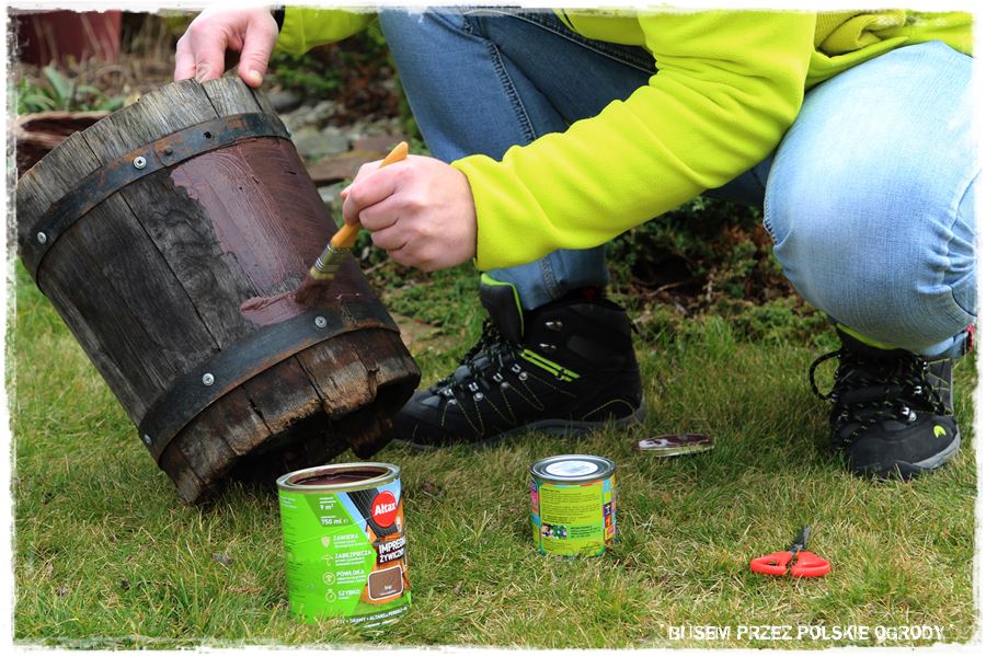 Podczas prac postawiliśmy również na małe malowanie, a konkretnie zabezpieczenie impregnatem żywicznych starego, drewnianego wiaderka.