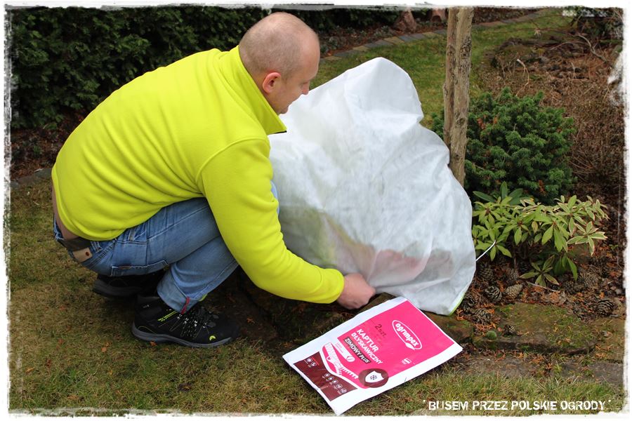 Okryliśmy również zimowymi kapturami wrażliwe rododendrony, bo mimo że to końcówka lutego, to w prognozie zapowiadają silne przymrozki.