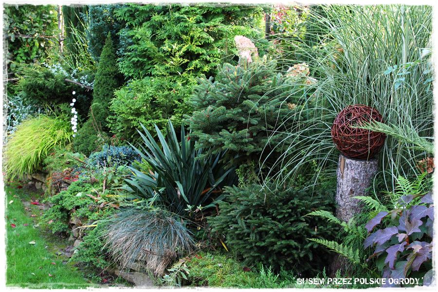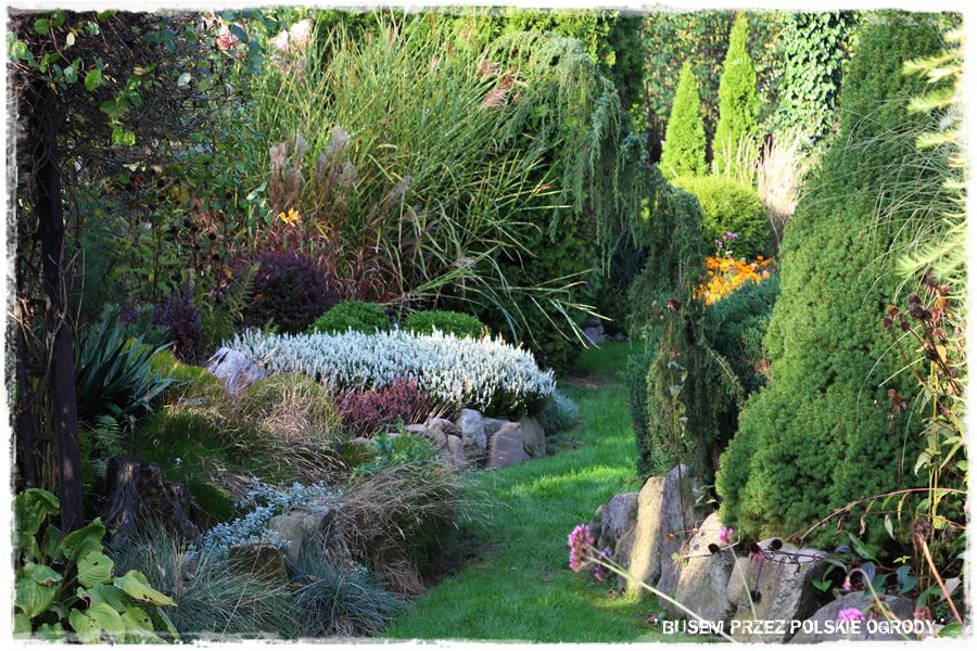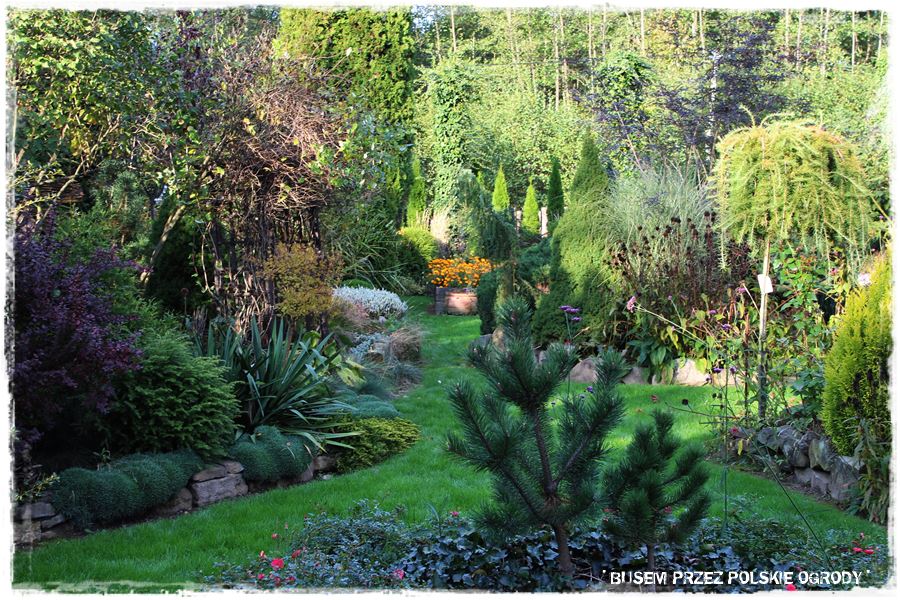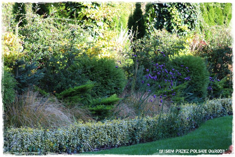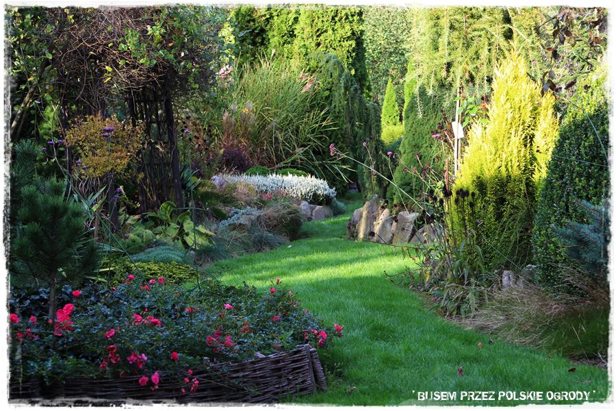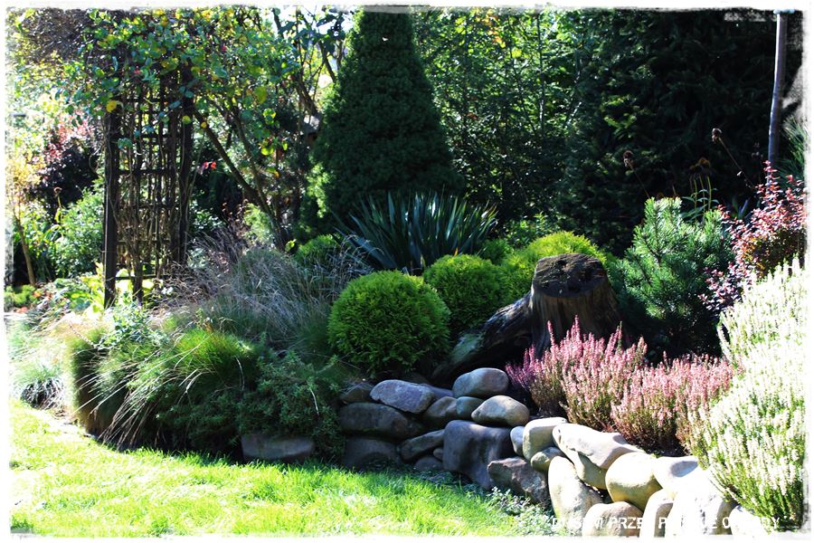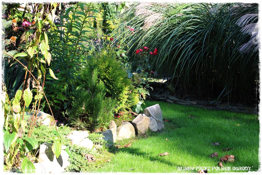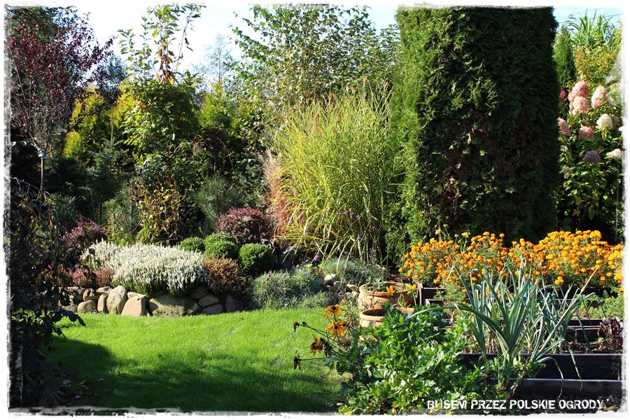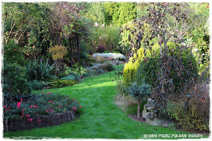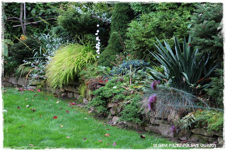 Dodatkowo, cały obrys działki to jedna, długa, ciągnąca się rabata, która „co krok” zmienia swoje oblicze. Raz jest płytsza, raz głębsza, raz wyższa, raz niższa. W każdym razie cały czas pięknie obsadzona, przeróżnymi gatunkami, tworzącymi różnorodne, stopniowane kompozycje.