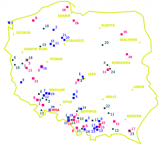 Kolor czerwony to tradycyjnie miejsce skąd wyruszyłem, a ten różowy kwadrat z numerem 22, to właśnie lokalizacja dwudziestego drugiego ogrodu, położonego w województwie małopolskim, w okolicy Wieliczki. Do pokonania miałem zatem średnią odległość, około 260 kilometrów w jedną stronę. Na mapie widać również: