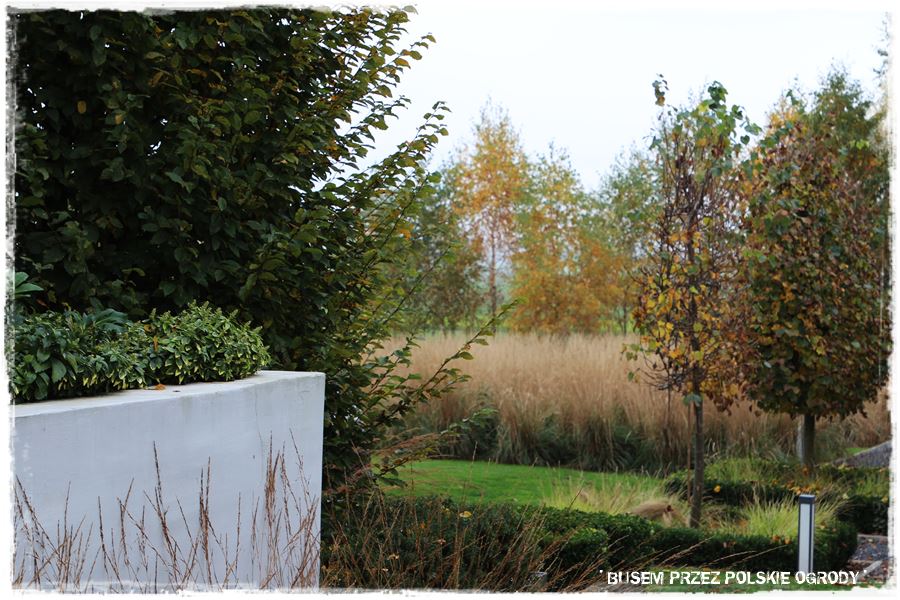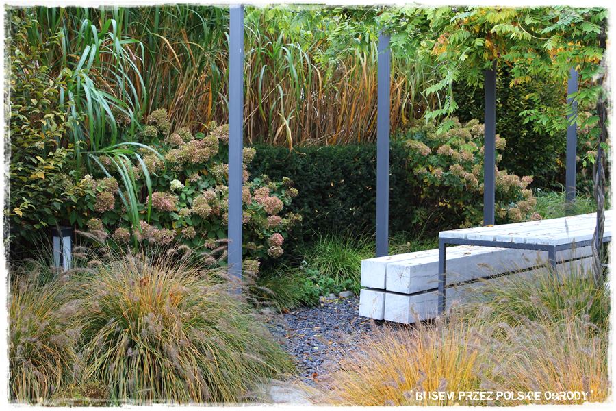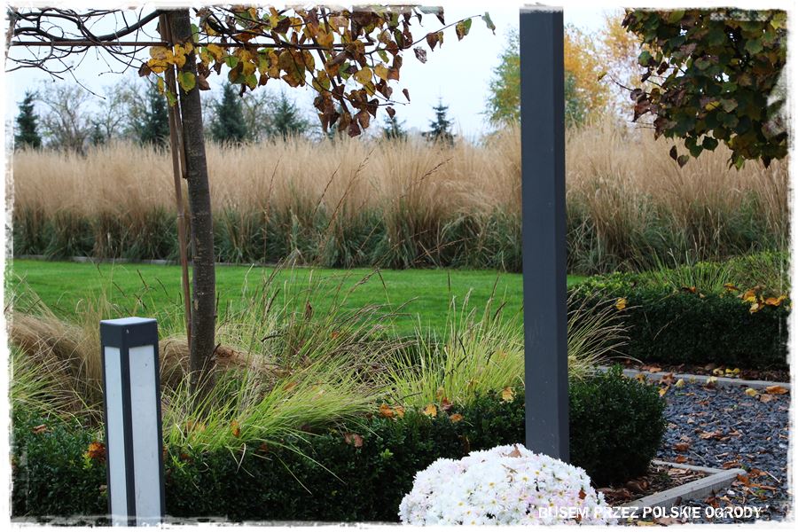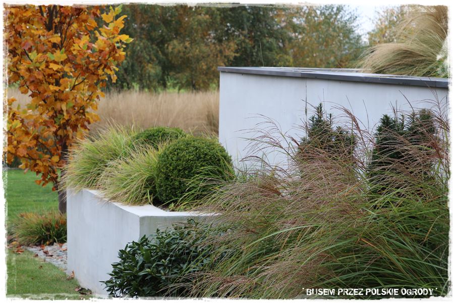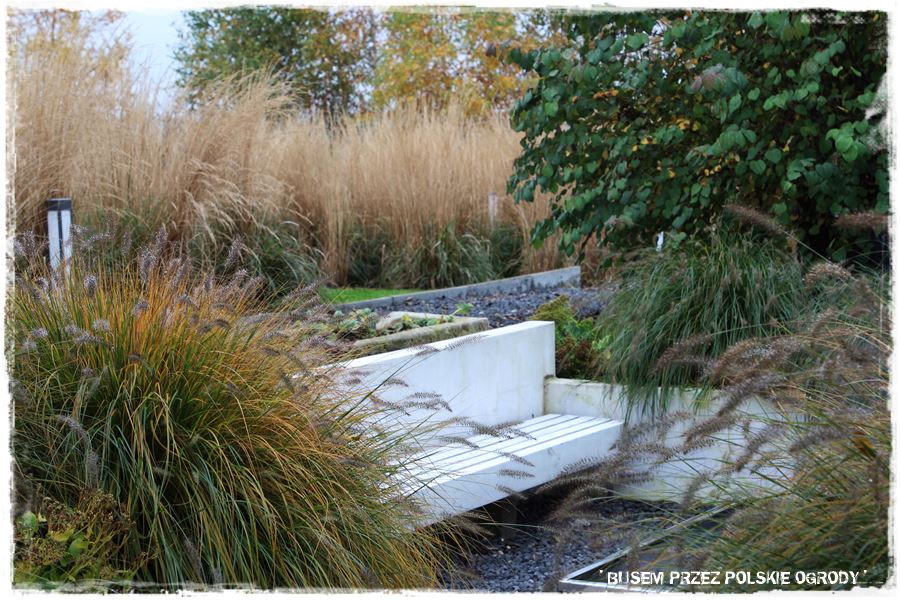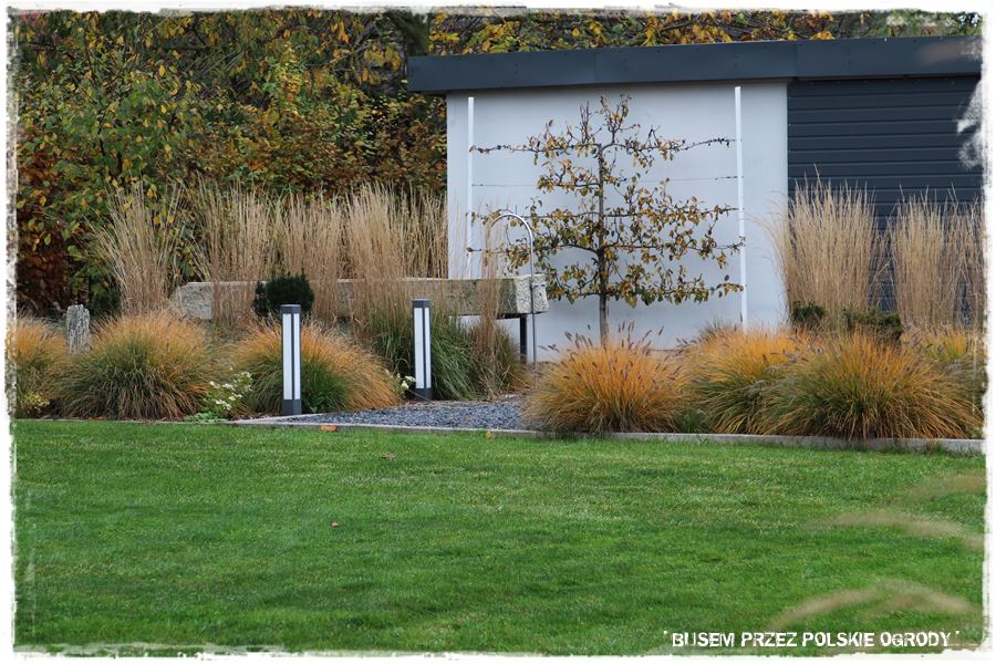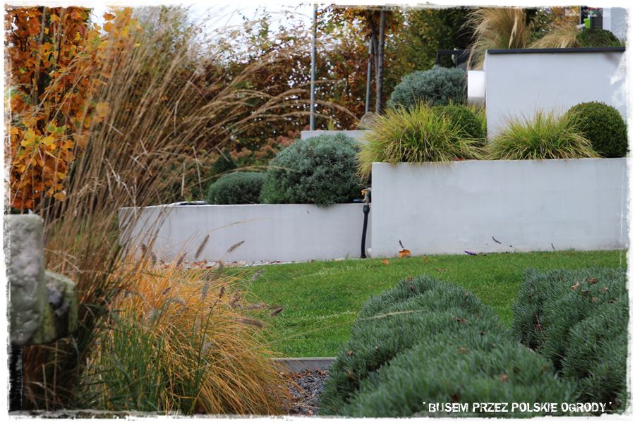 Od pewnego czasu moje ogrodowe relacje staram się upraszczać tzn. zdecydowanie mniej w nich pisać. Tak będzie i tutaj, gdzie zdjęcia wyraźnie biorą górę nad komentarzem. Co więc wartego jest podpatrzenia, a zarazem stanowi ważne elementy tego ogrodu? Jest tego trochę, a jak na ogród trawiasty przystało, ogród zachwyca zarówno trawami, jak i ciekawymi elementami zagospodarowania. Jest to zdecydowanie ogród nowoczesny, w którym architektura nowoczesnego budynku, łączy się z nowoczesnym urządzeniem ogrodu.