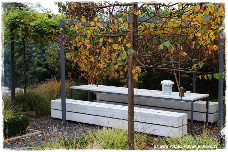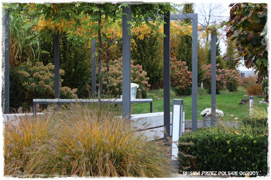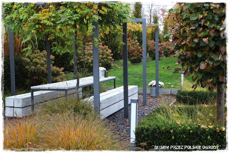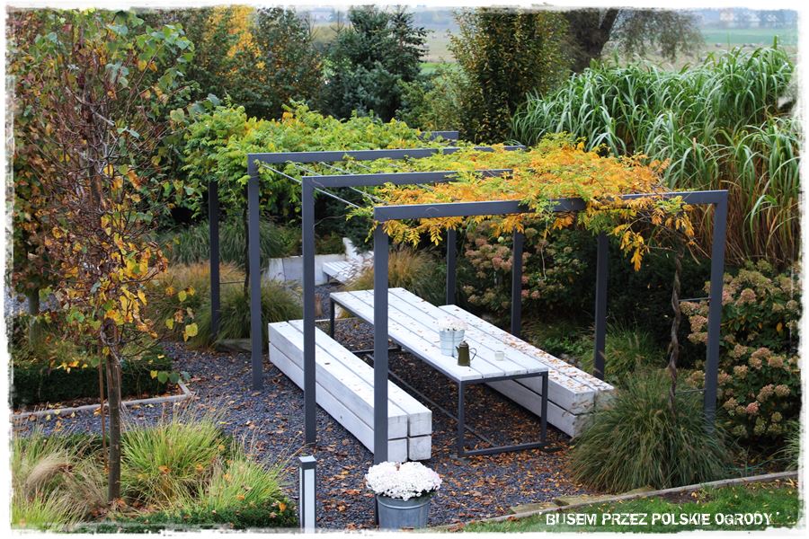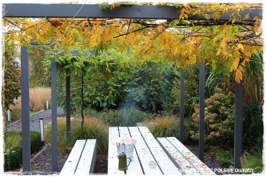 Wspominana nowoczesna pergola będąca po prawej stronie to metalowa konstrukcja, fajnie porośnięta glicynią.