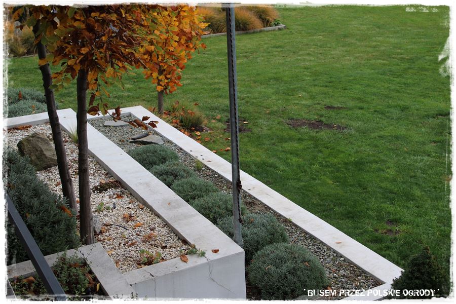 I to właśnie tutaj dzieje się to, co najlepsze w tym ogrodzie. Zacznę od niezwykle efektownych murów, które zostały wykonane jako alternatywa dla skarpy, łączącej tył budynku z będącym nieco niżej poziomem ogrodu. To wyjątkowo oryginalne rozwiązanie, które umożliwiło wypłaszczenie terenu, stworzenie kilku poziomów, na których powstały niejako wielkie, nowoczesne donice.