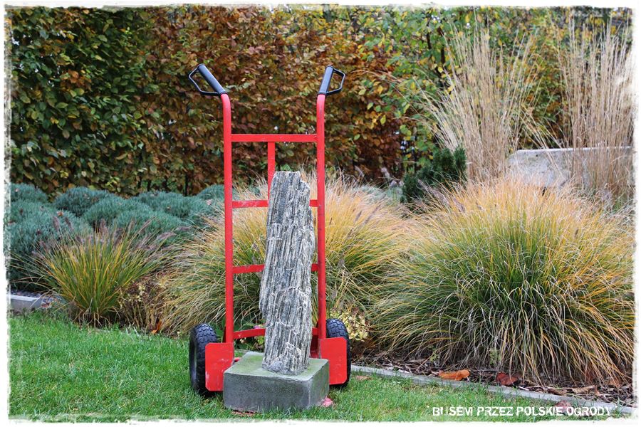 Dodatkowo przywiezioną szpilkę gnejsową ustawiliśmy na jednej z rabat, gdzie pięknie wkomponowała się pomiędzy rozplenice japońskie ‘Hameln’.