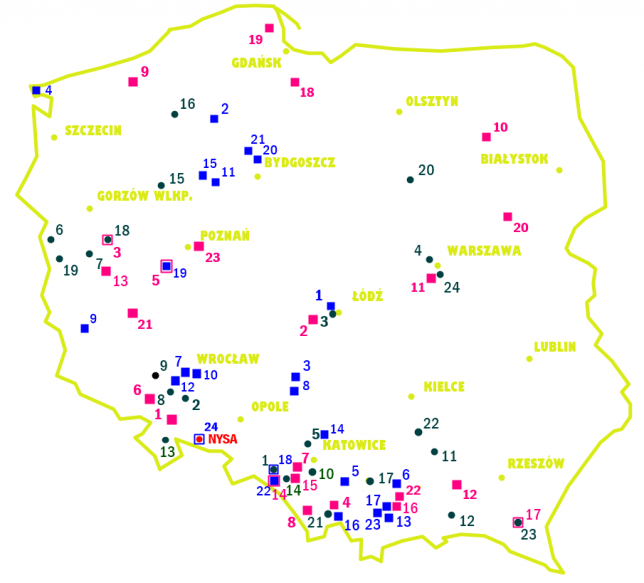 Kolor czerwony to tradycyjnie miejsce skąd wyruszyłem, a ten różowy kwadrat z numerem 23, to właśnie lokalizacja dwudziestego trzeciego ogrodu, położonego w województwie wielkopolskim, w okolicy Poznania. Do pokonania miałem zatem średnią odległość, około 310 kilometrów w jedną stronę. Na mapie widać również: