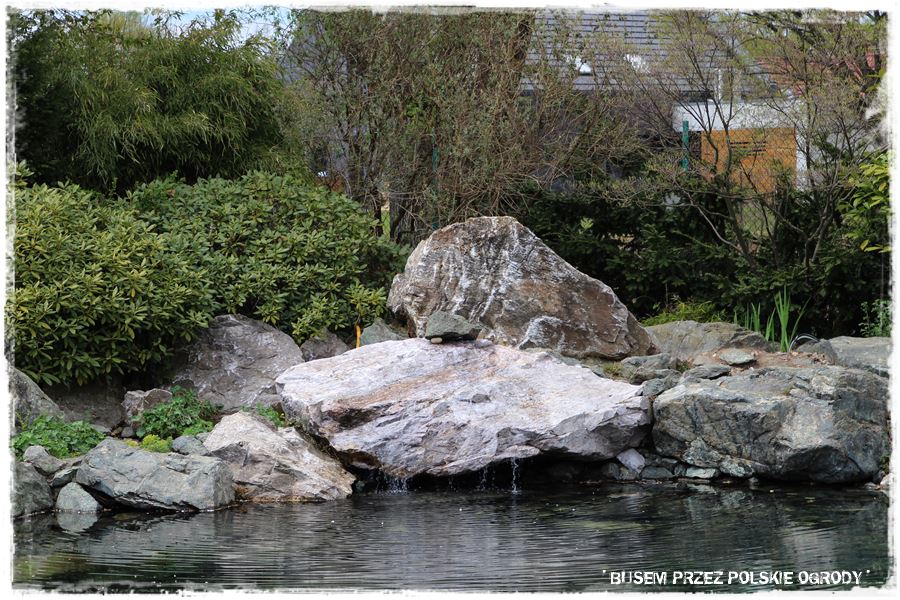 Wartym podkreślenia są również naturalne korzenie przy zbiorniku ozdobnym, piękne serpenitowe głazy, czy chociażby brzozowa pergola.