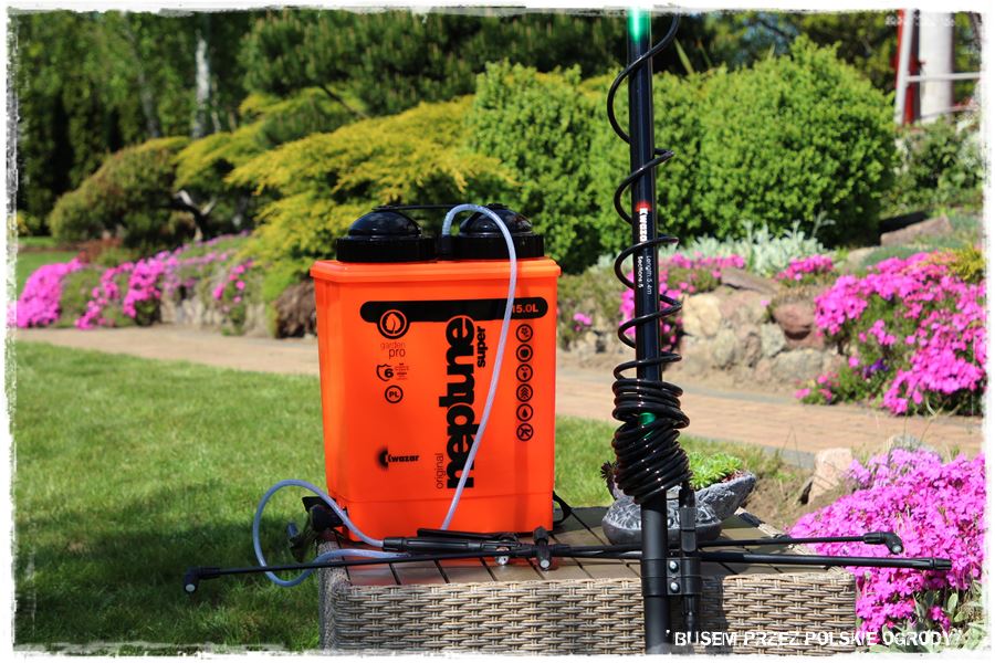opryskiwacz plecakowy wraz z wymiennymi dyszami – potrójną pozwalającą do np. efektywnego oprysku trawnika oraz na wysięgniku 5 metrowym umożliwiającą oprysk wysokich drzew