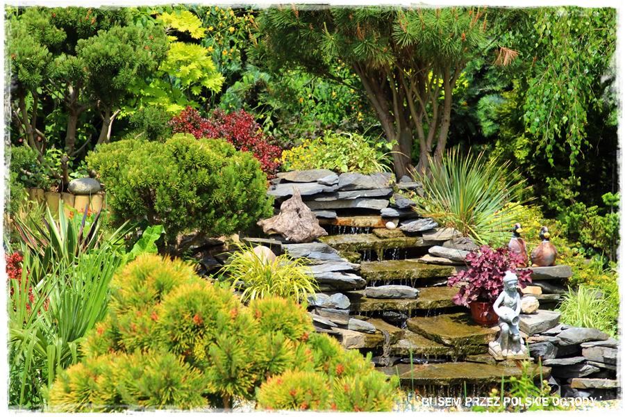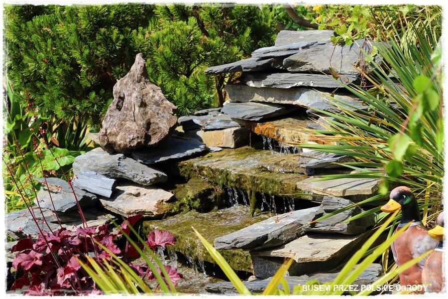 Więc kącik ten do duże, efektownie obsadzone oczko z kamienną kaskadą,