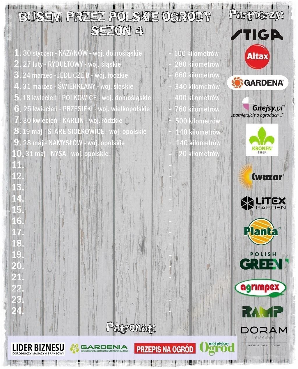 niebieskie kwadraty z numerami od 1 do 24, które obrazują wszystkie ogrody odwiedzone w sezonie 2 – 2019