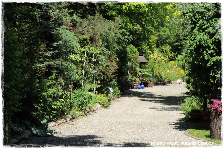 Charakterystycznym elementem ogrodu jest długi wjazd, który przebiega wzdłuż jednego z boku działki i ciągnie się w głąb ogrodu, mniej więcej do połowy jego długości, na dobre moim zdaniem 100 metrów. Po drodze mija zabudowania i kolejne strefy, które jak wszystko, są gęsto i pięknie porośnięte.