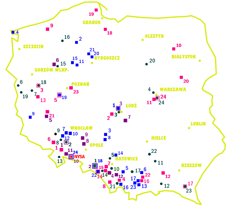 Kolor czerwony to tradycyjnie miejsce skąd wyruszyłem, a ten fioletowy kwadrat z numerem 12, to właśnie lokalizacja dwunastego ogrodu, położonego w województwie śląskim. Do pokonania miałem zatem średnią odległość, około 190 kilometrów w jedną stronę. Na mapie widać również: