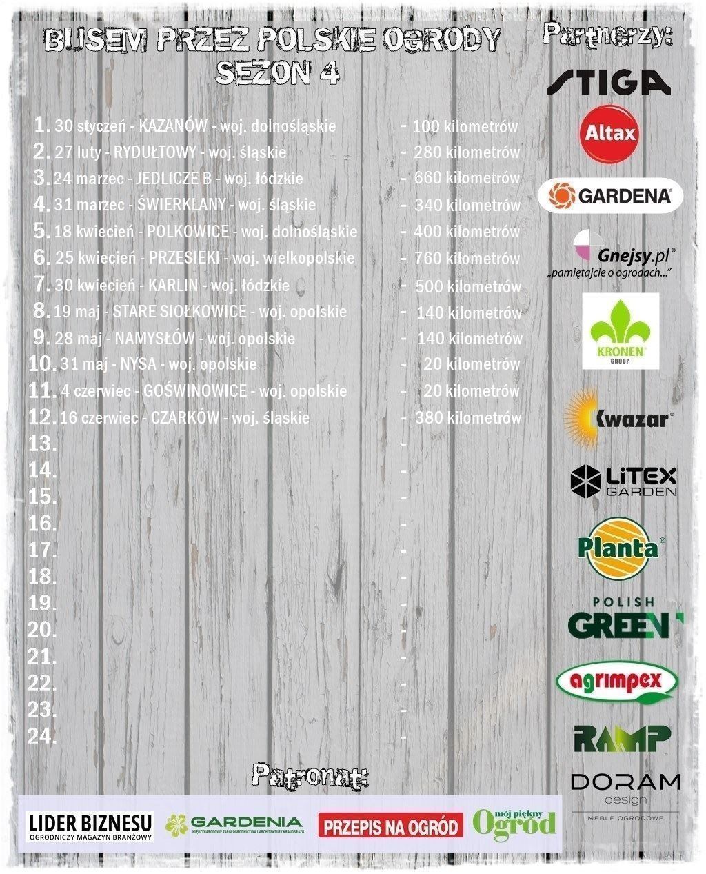 niebieskie kwadraty z numerami od 1 do 24, które obrazują wszystkie ogrody odwiedzone w sezonie 2 – 2019