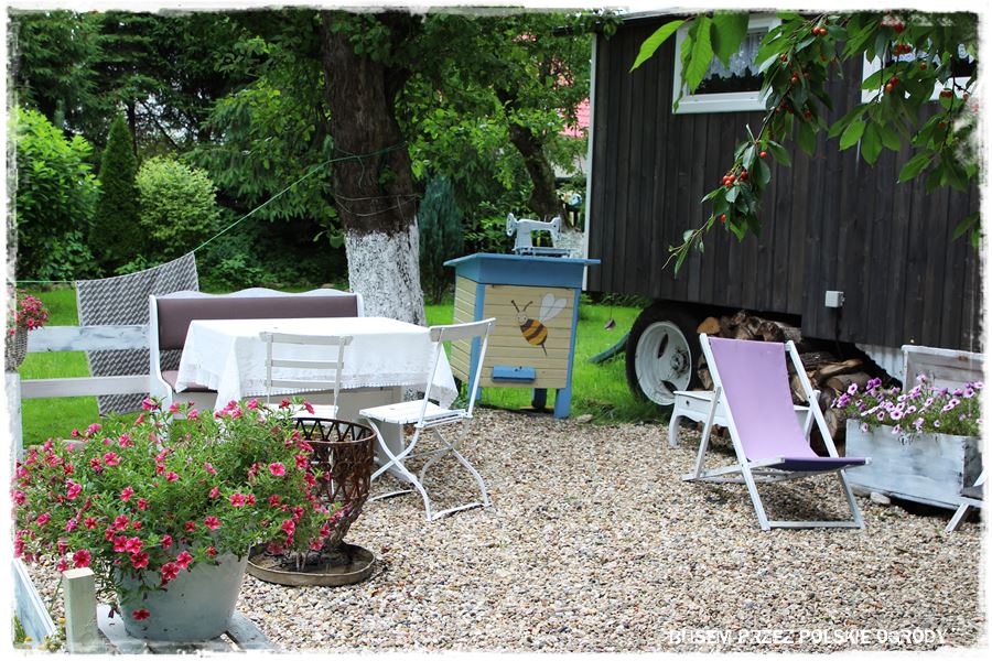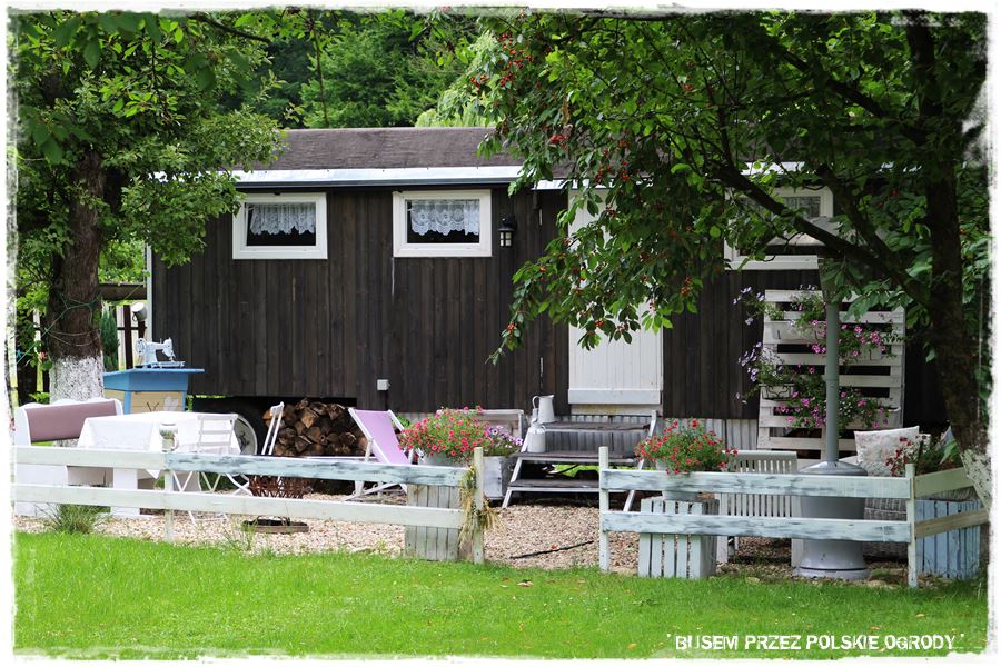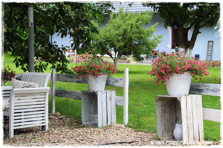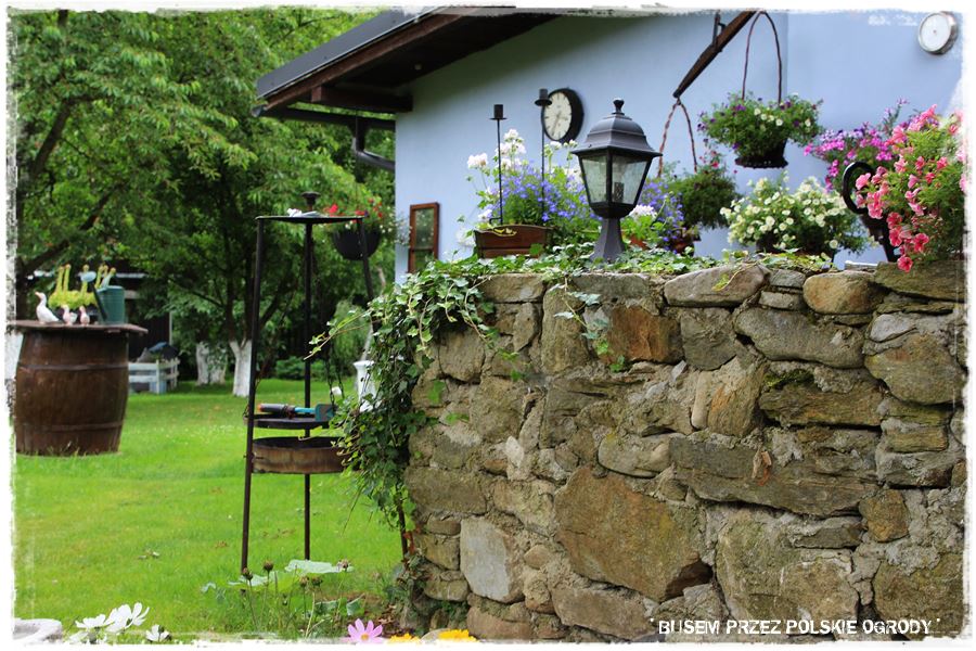 I tak faktycznie jest. Ogród, to stare siedlisko z około 100 letnim domem, który Gospodarze nabyli około 20 lat temu i jak to się ładnie mówi, nadali mu drugie życie. Ale to życie jak najbardziej jest kontynuacją tego poprzedniego, ponieważ dom zachował swój pierwotny charakter, zarówno za sprawą samej architektury, jak i wszechobecnych dekoracji i dodatków. Dodam jeszcze, że zyskał za to oryginalny niebieski kolor, stąd właśnie nazwa „niebieski domek Burgrabice”. 🙂