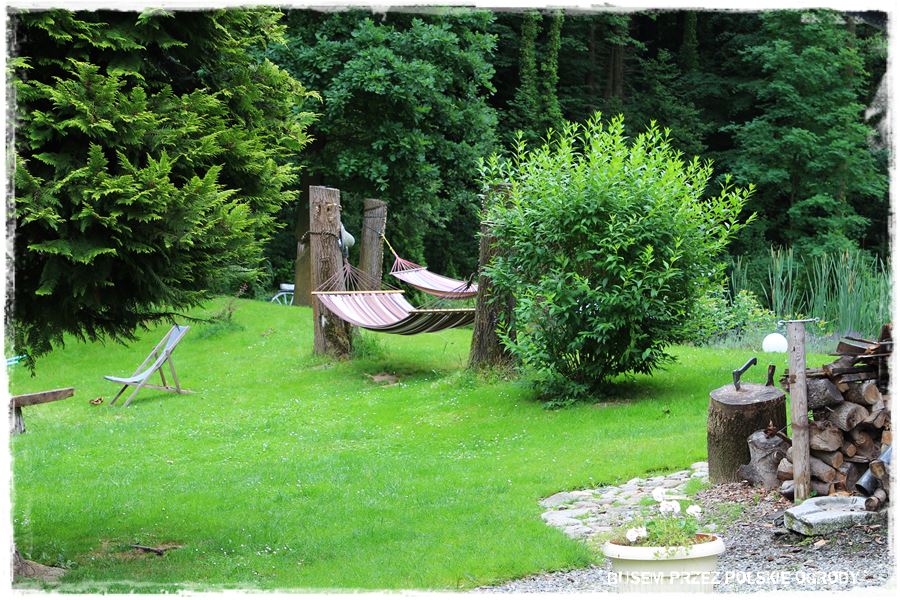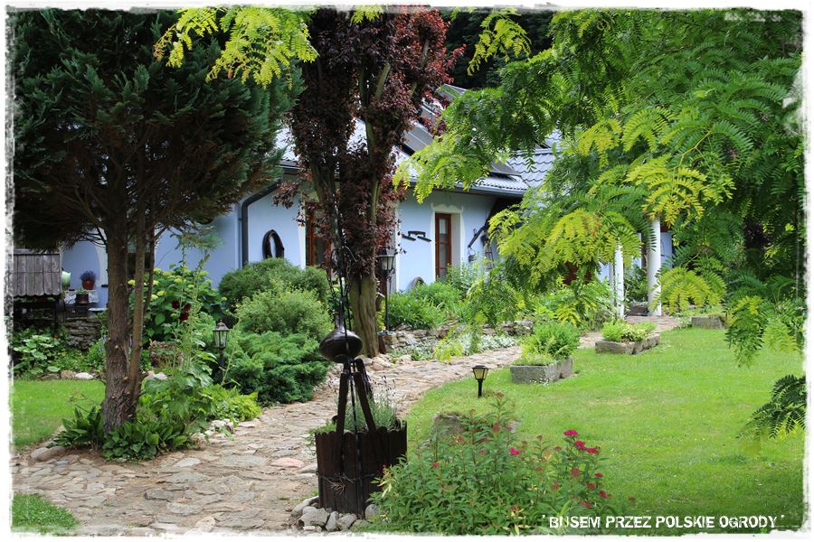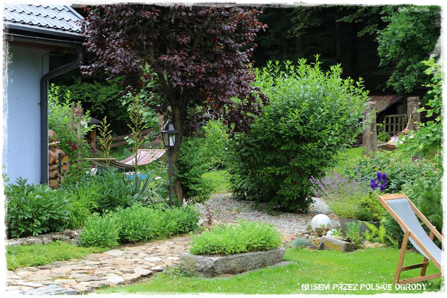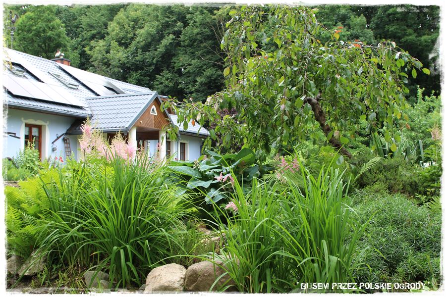 Czternasty ogród w moich tegorocznych podróżach, jak już wiesz, położony jest w niewielkiej miejscowości w Górach Opawskich, tuż przy granicy z Czechami. Teren jest więc już nieco pagórkowaty i taka również jest działka, na której urządzony jest ogród. Jedna jej część to obszar zagospodarowany, na którym znajduje się niebieski domek i ogród, a druga to duża skarpa, gęsto porośnięta, wyglądająca jak prawdziwy las. A zatem nieco wyłączona z codziennego użytkowania.