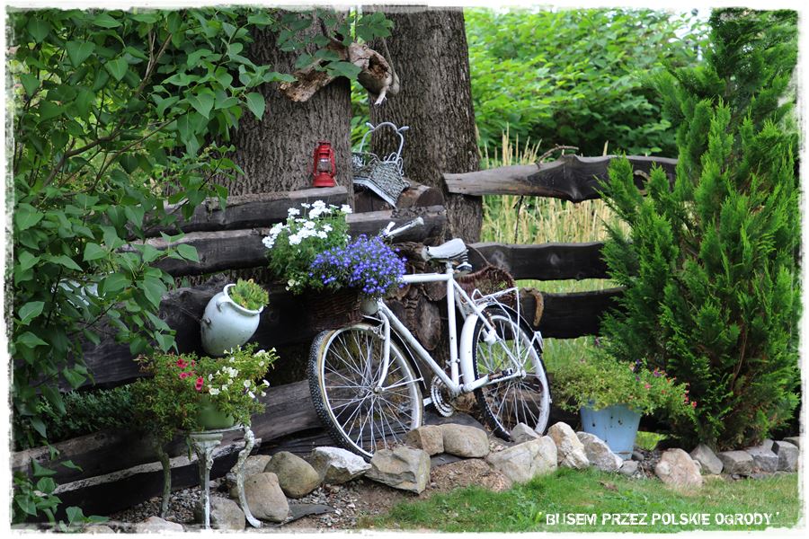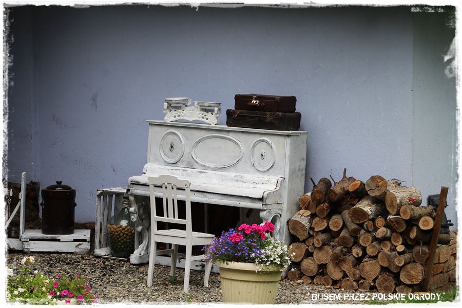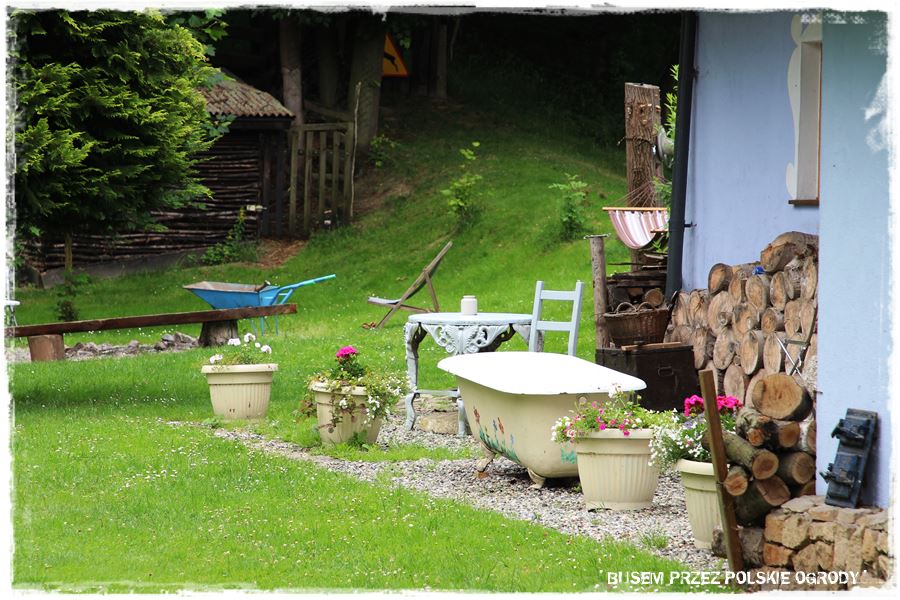 Do dekoracji ogrodu, szczególnie w takim stylu, może posłużyć dosłownie wszystko. Każdy, pozornie niepotrzebny przedmiot może być samodzielną dekoracją, albo np. stać się efektowną donicą,