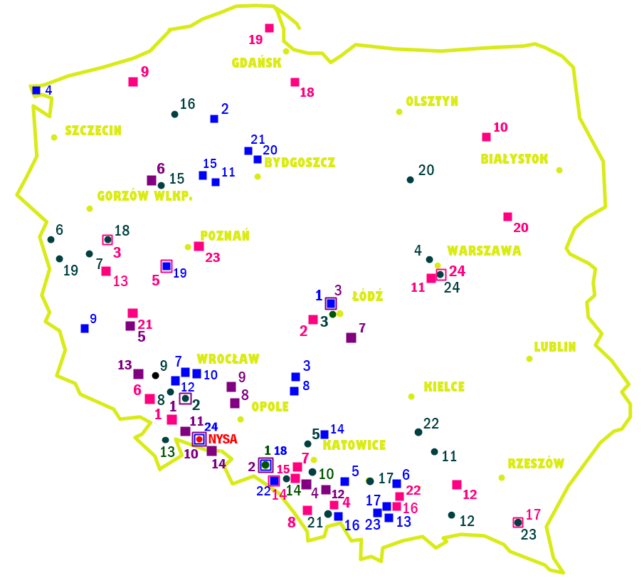 Kolor czerwony to tradycyjnie miejsce skąd wyruszyłem, a ten fioletowy kwadrat z numerem 14, to właśnie lokalizacja czternastego ogrodu, położonego w moim rodzinnym województwie opolskim. Do pokonania miałem zatem symboliczną odległość, około 25 kilometrów w jedną stronę. Na mapie widać również: