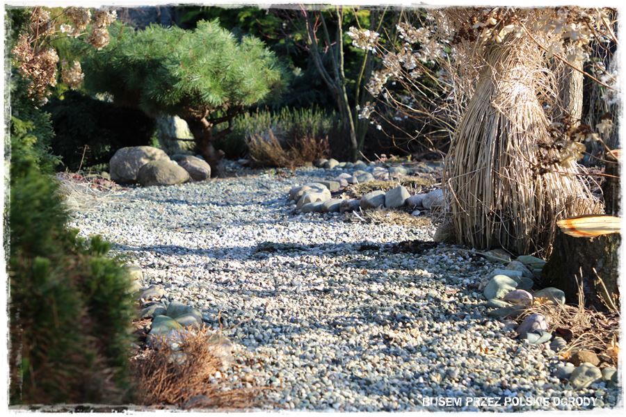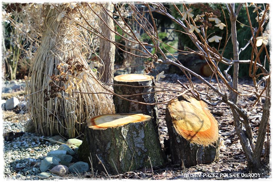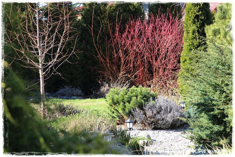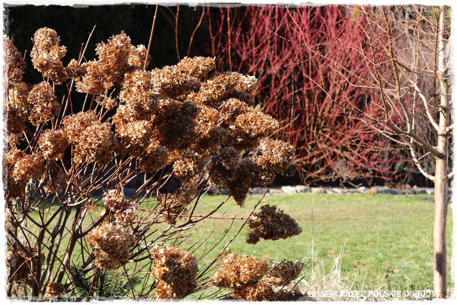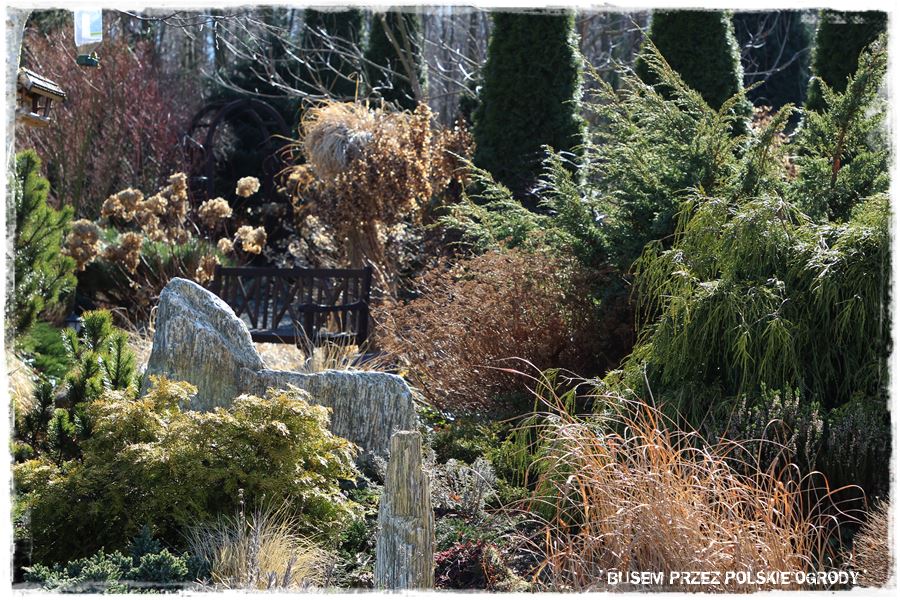 Dopiero pomiędzy nie, dyskretnie wkomponowane są gatunki liściaste, które teraz zimą, schodzą na drugi plan. Zrobione jest to jednak na tyle umiejętnie, że ogród nie pustoszeje, a wręcz przeciwnie, dostaje dodatkowego uroku. Chociażby za sprawą czerwonych pędów dereni, czy zasuszonych traw i hortensji.