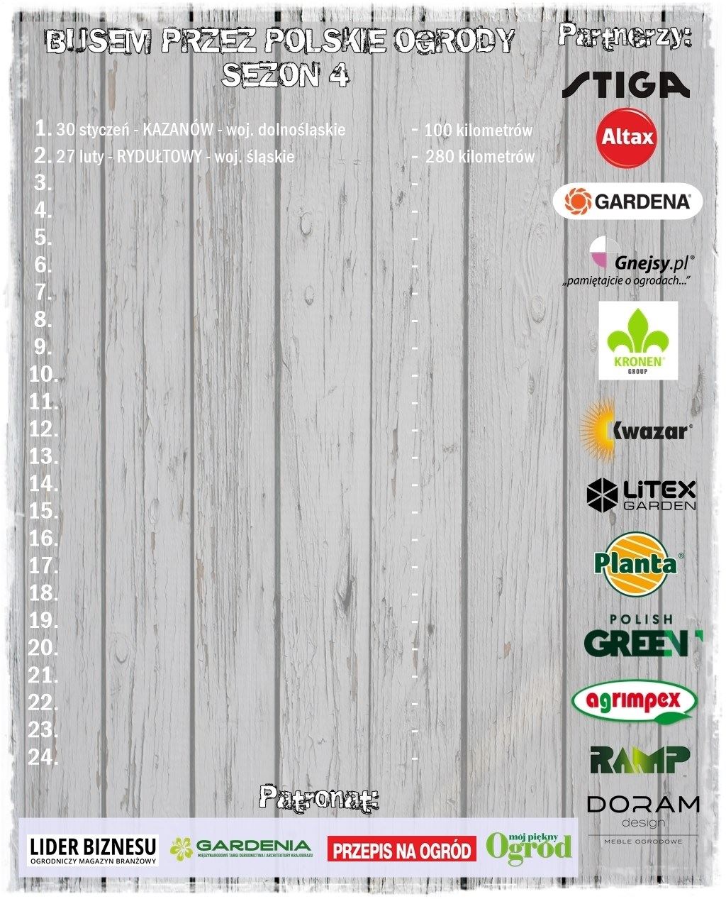 ciemnozielone kropki z numerami od 1 do 24, które obrazują wszystkie ogrody odwiedzone w sezonie 1 – 2018