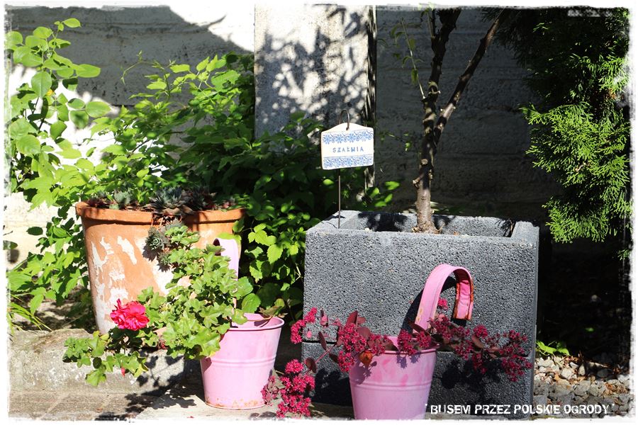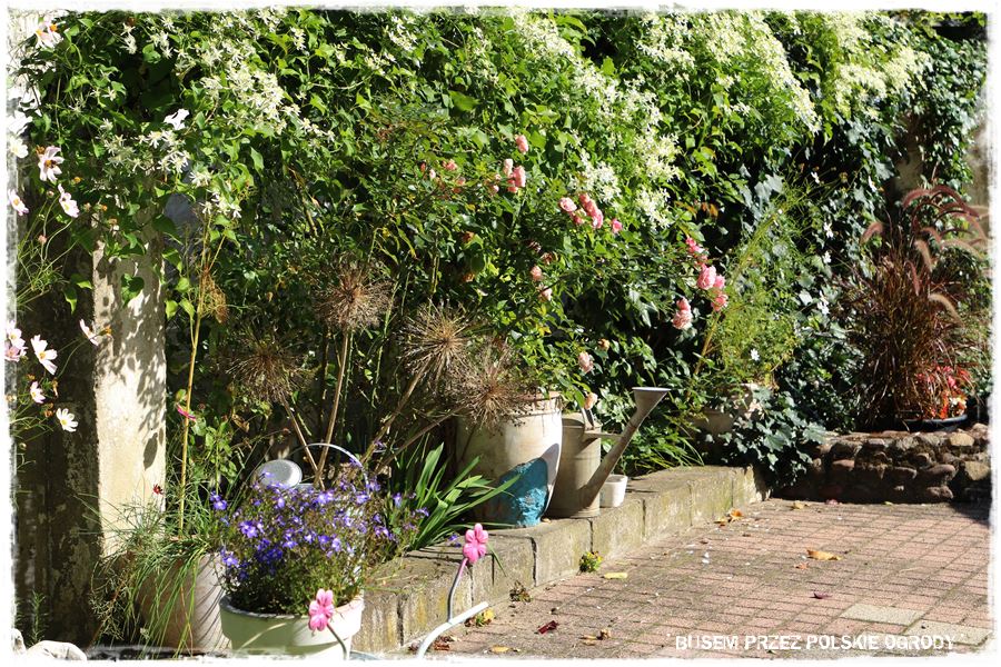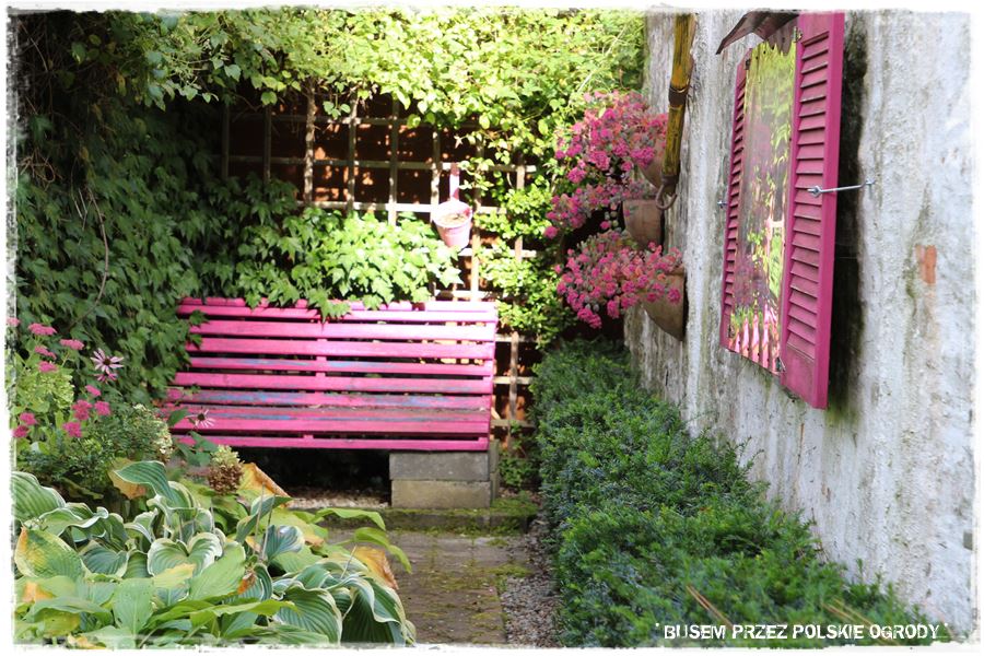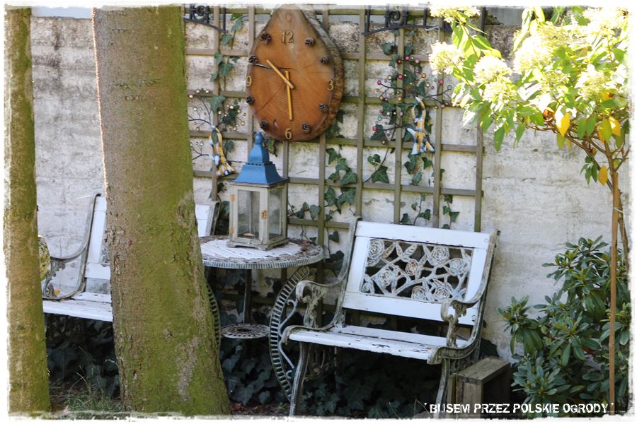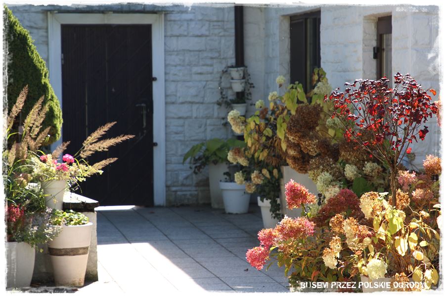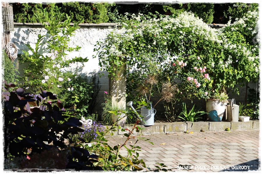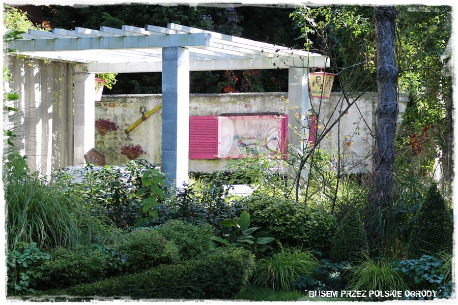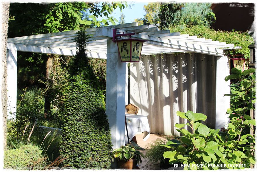 No dobrze, ale wracając do kolorów. Są obecne głównie w sposobie zagospodarowania i licznych dekoracjach, o których warto, a nawet trzeba wspomnieć. Na początek oryginalna strefa w tonacji białej, zlokalizowana we frontowej części ogrodu, tuż po przekroczeniu bramy. Przypomina trochę włoskie patio, tym bardziej, że zaaranżowana jest donicami, oczywiście ładnie obsadzonymi.