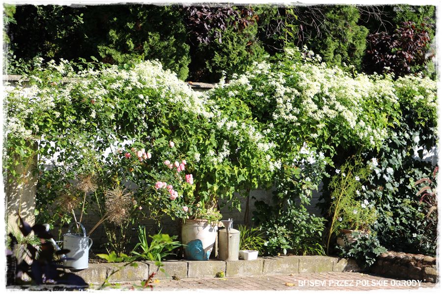 Patio z jednej strony ogranicza budynek mieszkalny, a z drugiej mur, również biały, który jest dobrym tłem dla roślin, chociażby jesiennej odmiany powojnika.