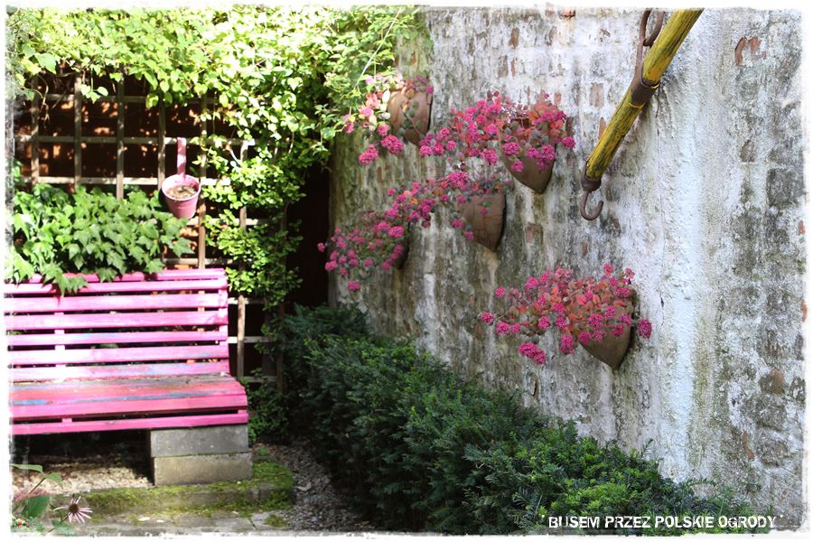 A te nowe, to przede wszystkim nieco romantyczny, różowy kącik, wkomponowany w niewielki zaułek ogrodu, szczelnie osłonięty wspominanym już murem. Od razu dodam, że widoczne na ścinie rozchodniki dobrze to uzupełniają i jak wspomniała Irena, zimują tam sobie spokojnie całą zimę.