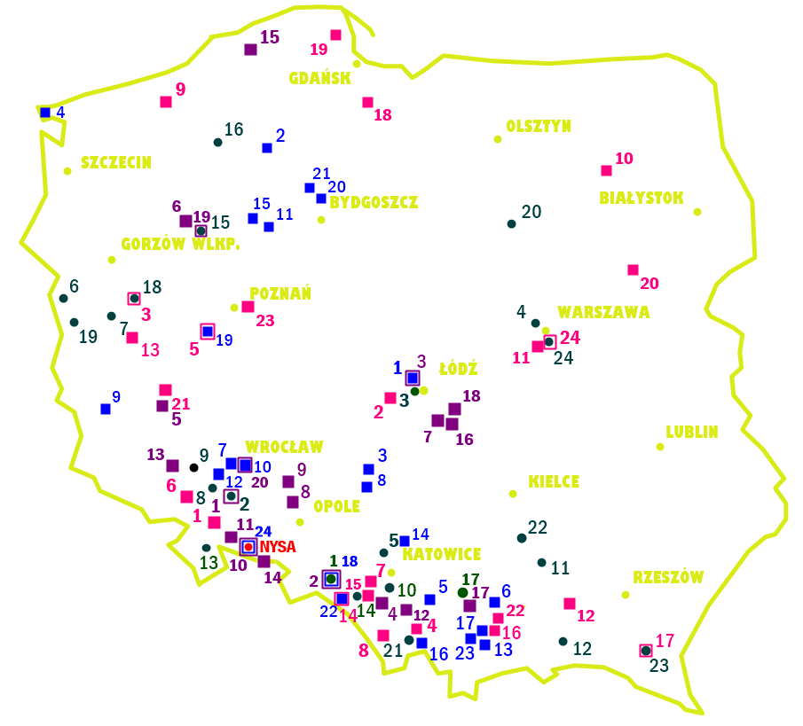 niebieskie kwadraty z numerami od 1 do 24, które obrazują wszystkie ogrody odwiedzone w sezonie 2 – 2019