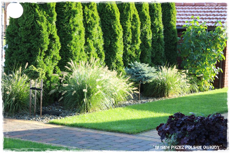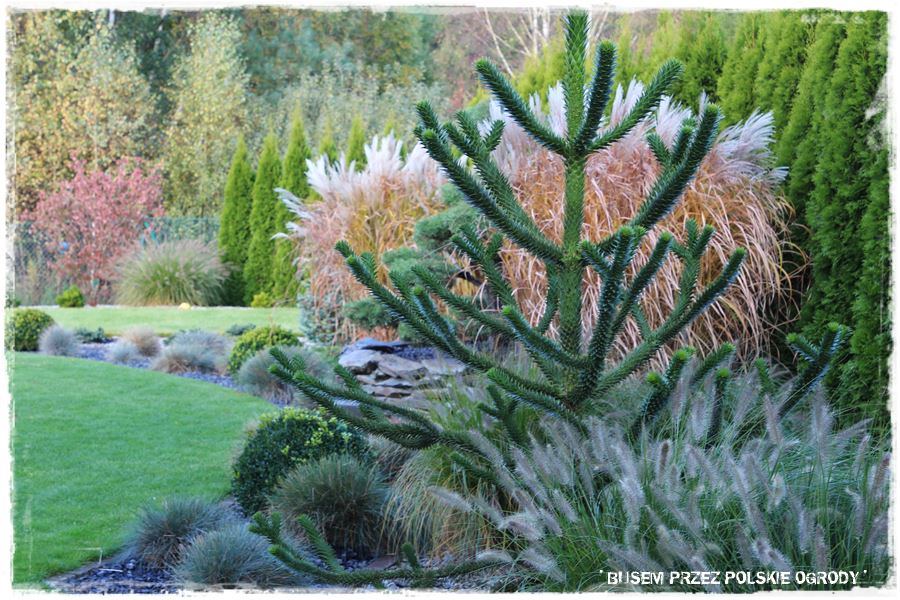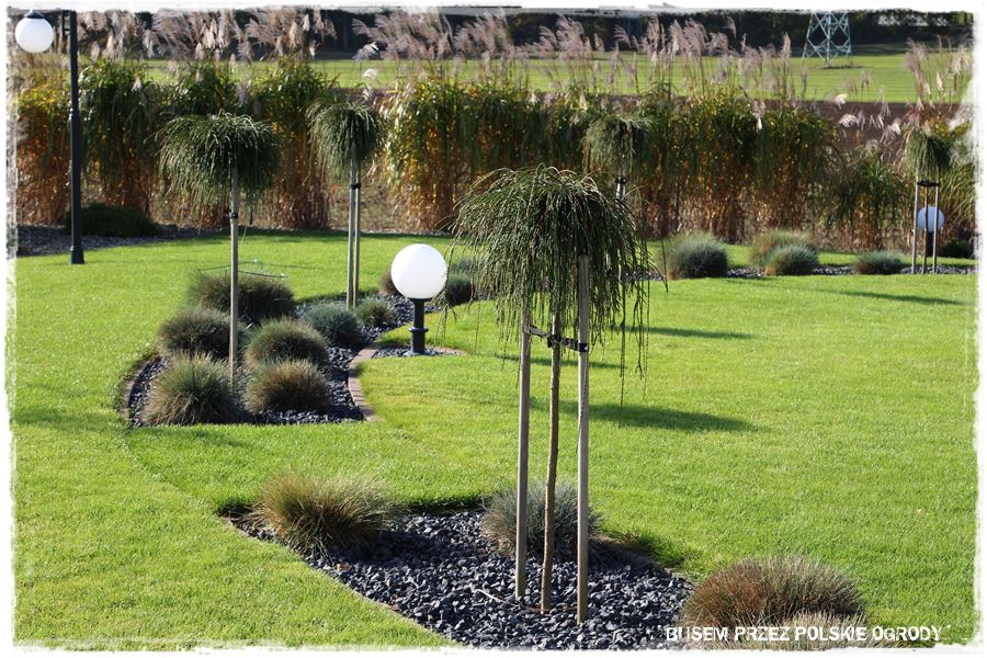 znajdują się kuliste akcenty z bukszpanu i kępiastej rozplenicy japońskiej oraz kostrzewy popielatej.